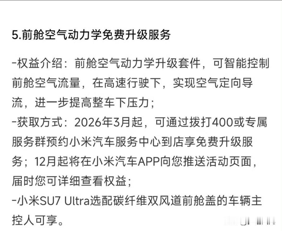 小米su7ultra碳纤维风道打孔的后续来了!小米宣布为su7ultra车主推出10月秋季关怀,其中就包括su7ultra前仓空气动力学升级。 本来这事儿都时隔几个月了,大家都快忘记了,为何现在又提出此事?一些网友提出了自己的质疑,如: 是不是意味着以前的风道是假的,现在才是真的? 是不是败诉了,不得不出来回应一下,如被召回一样? 当然这都是网友的无端猜测,之前爆出的车主诉告小米,法院驳回的也只是管辖权异议,至于这管辖权异议,提出的时机是不是为了拖延时间,不做讨论与猜测。就事论事,之前的碳纤维车盖风道一事确实给小米带来了很大的负面影响,也极大的影响su7ultra的后续销量,不知道这这一波福利的推出,能不能提高 su7ultra的销量(听说现在每周只有20多辆的样子),能不能扭转小米近期不断下沉的负面影响。 今年以来,小米突遭舆论反噬,它的宣传不得不承担一部分责任。相比起颜值,车子的安全才是第一位。营销不能仅仅列参数,而是要各方面做综合评估。不然。出了事负面就铺天盖地地来,这不是一家大型企业将自己置入危局的策略。 年底还有三个月,小米的汽车销量能超过现在吗?