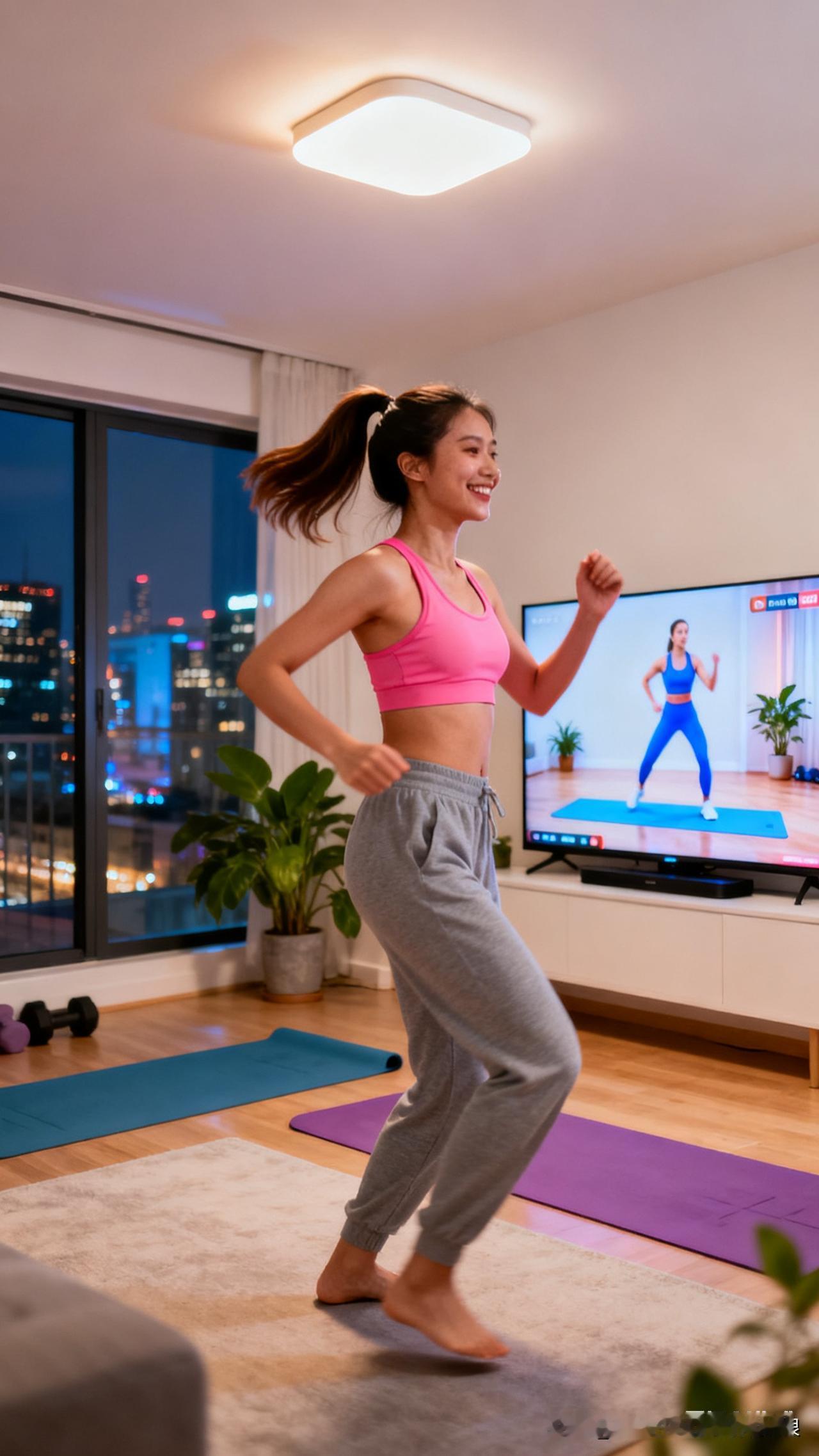 谁懂啊!跟着直播间跳有氧+无氧健身操,整整一个半小时,汗跟不要钱似的往下淌! 刚开始还能跟上节奏,后半程腿都在打颤,好几次想划水,看主播喊得带劲又咬牙扛住了。暴汗的感觉太绝了,累是真累,但跳完浑身通透,连呼吸都顺畅了! 不用去健身房,在家对着屏幕就能练,省时又省钱。运动哪有不苦的?但汗水不会骗人,坚持下去,马甲线、细胳膊细腿都在向我招手!今天这波虐到位了,明天继续冲!健身操 在家跳健身操 图片由AI生成