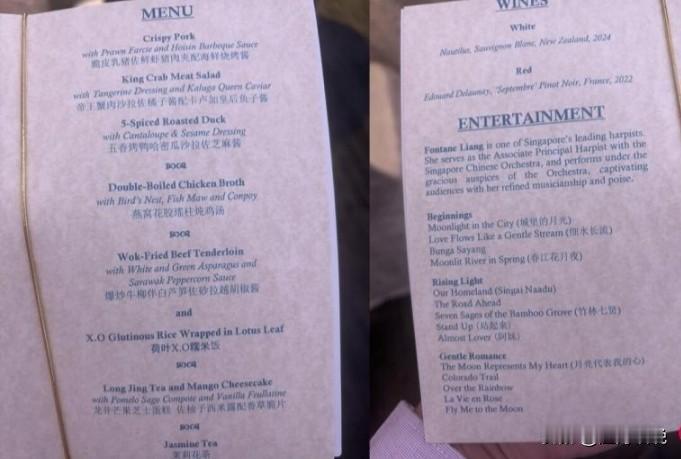 新加坡总理黄循财在滨海湾花园花田大厅为贵宾举行晚宴,以七道融合中西特色的佳肴款待客人。 菜单匠心独运:脆皮乳猪与五香烤鸭体显中式底蕴,帝王蟹沙拉和龙井芒果芝士蛋糕注入国际风味,燕窝花胶汤与XO糯米饭则体现南洋饮食精髓,佐以清雅的茉莉花茶更显文化交融。 现场由竖琴演奏家梁帼婷以《城里的月光》、《月亮代表我的心》等耳熟能详的经典曲目营造典雅氛围,同时也是为未来合作奏响新乐章!