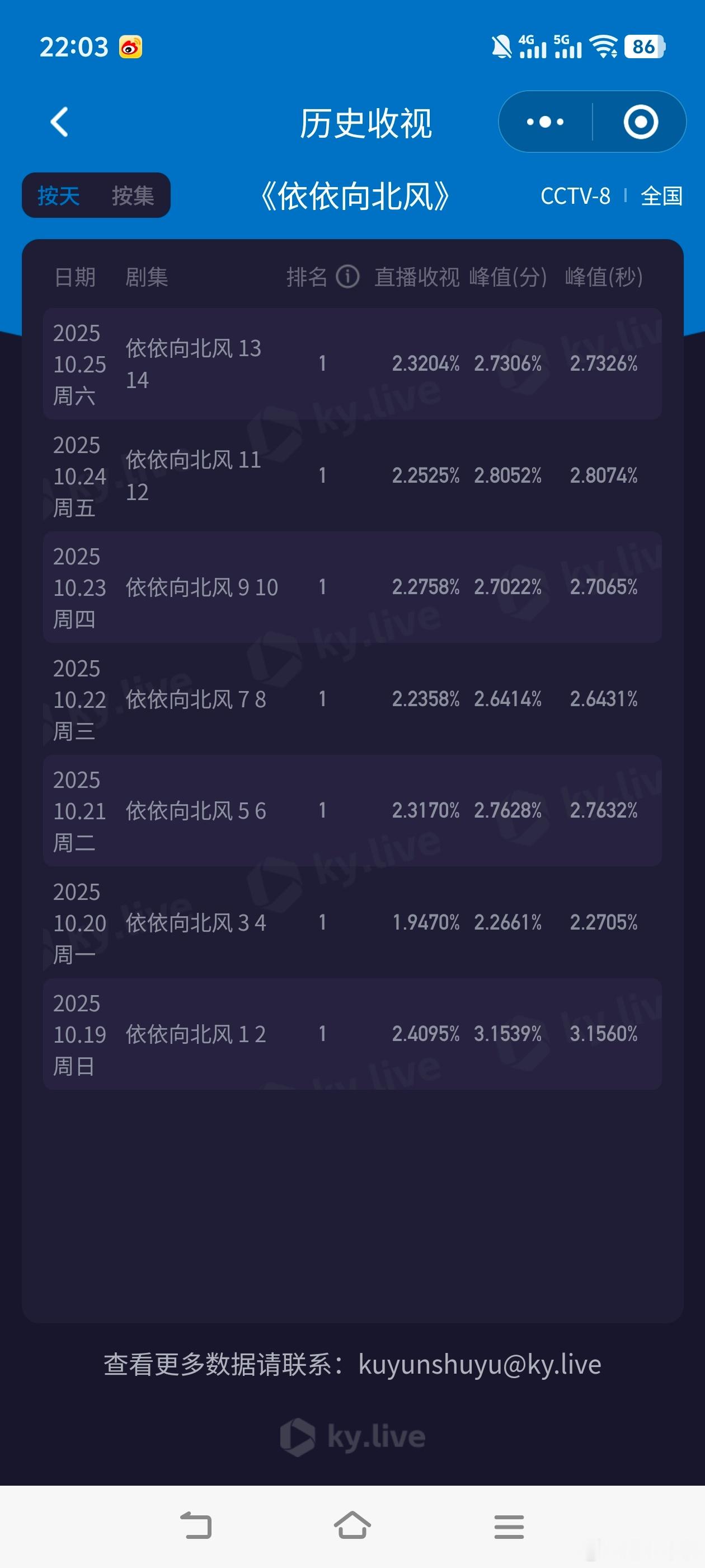 依依向北风周六又涨了!《依依向北风》今晚峰值2.7326,平均2.3204,单日平均仅次于首播日!看来每天酷云基本上稳定在2.2-2.3+这个范围了!