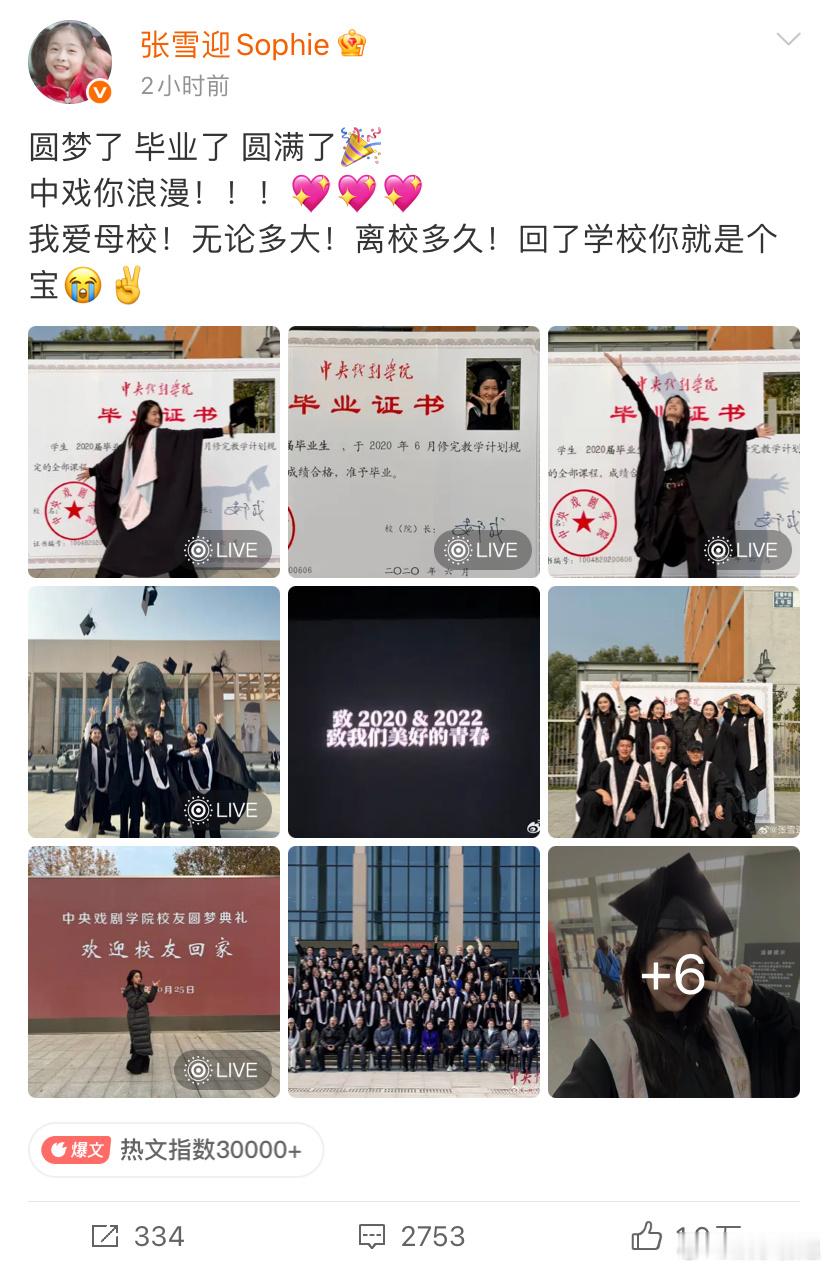 张雪迎晒中戏毕业照毕业了,学士服🎓也是穿上了✌🏻圆满了,弥补了当年的遗憾。祝雪迎毕业快乐💐 前程似锦[送花花]