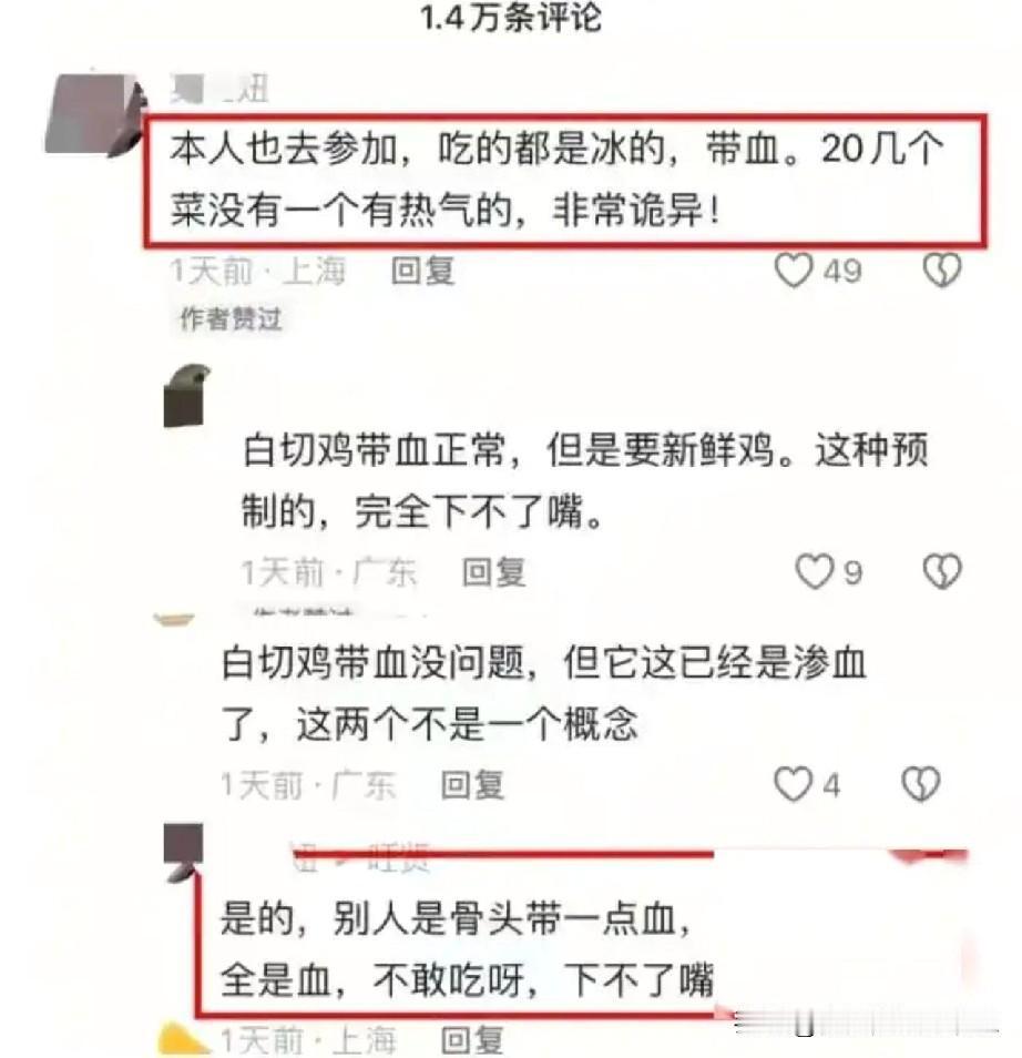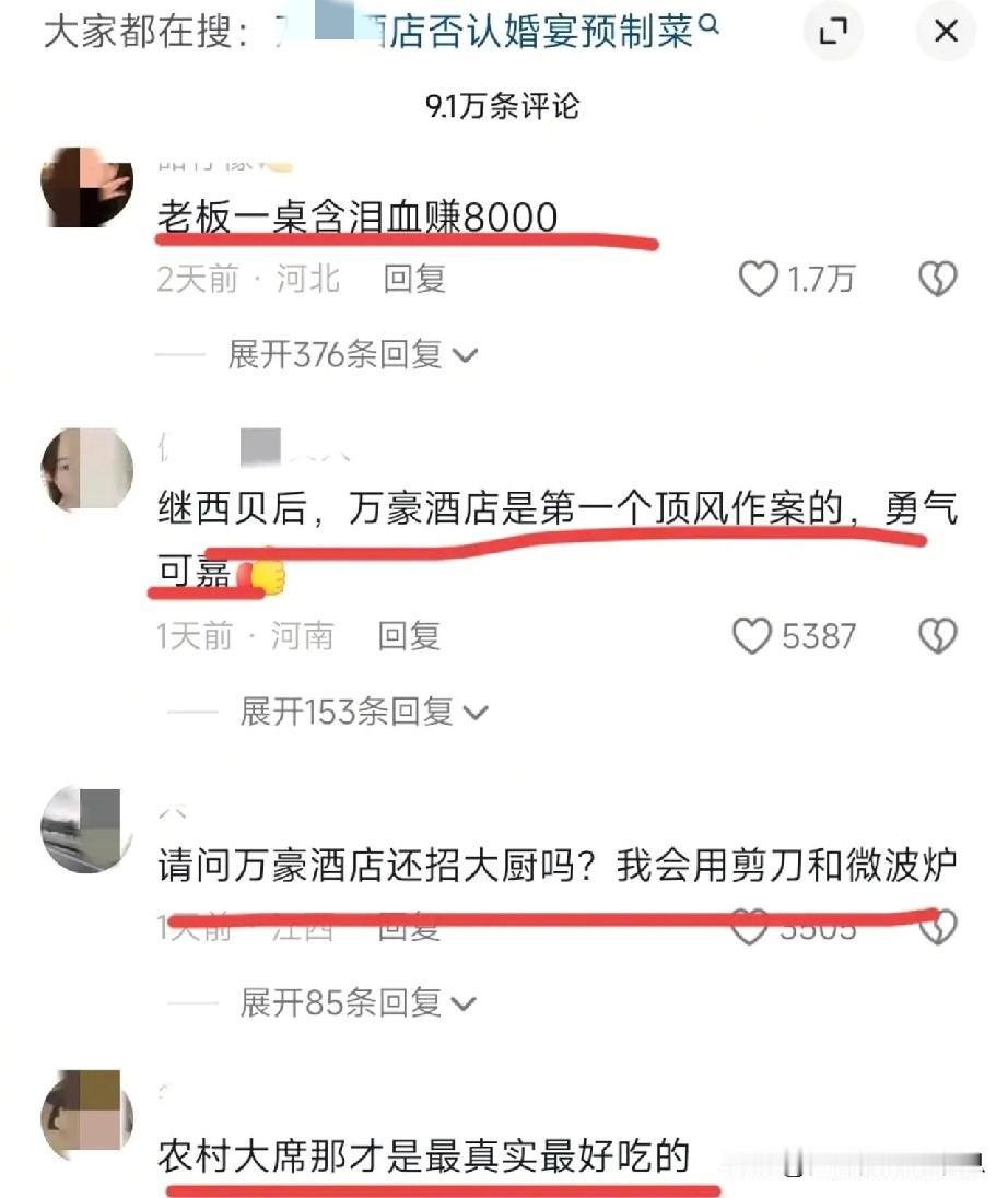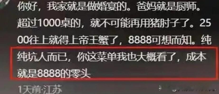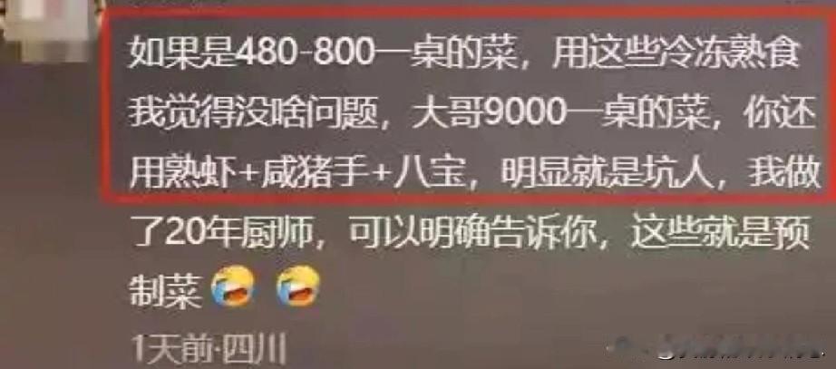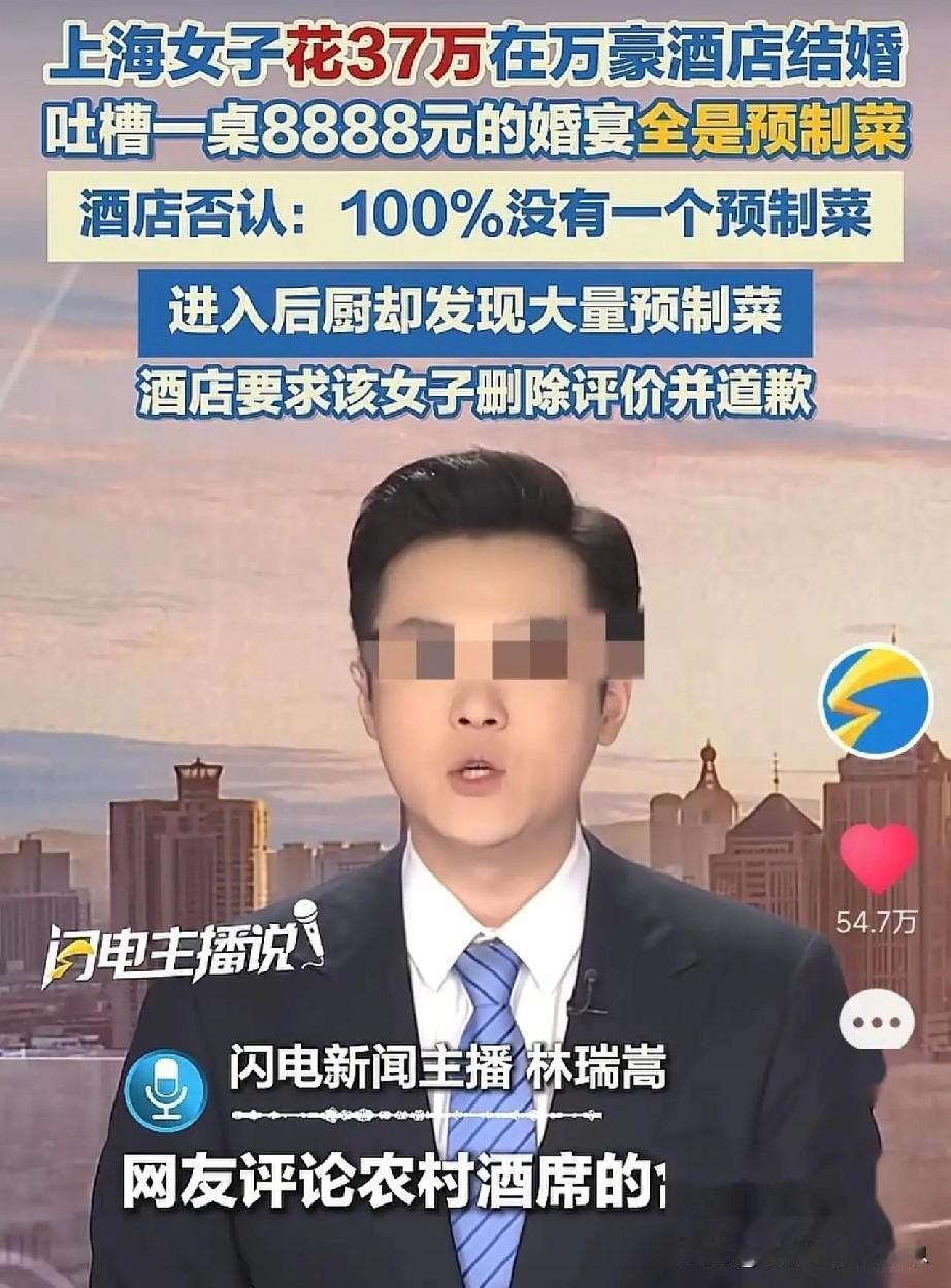 市监部门已出动,剩下的交给时间。 我们静等吃瓜就好。 起因是10月21日,在上海某女子举办的婚礼上,花了379800元预定43桌,每桌8888元,菜品新鲜热乎是少不了的。结果上菜竟是预制菜,菜品都是一眼预制。 新人当场愤怒了,质问酒店,酒店坚称没有使用预制菜。随后带着摄像头进入酒店查看厨房,发现大量预制菜,后厨环境极其混乱,新人十分失望。 婚礼当天的好心情全被破坏了,可气让大家看看这家酒店的真实面目后。没想到,这家酒店不仅没有道歉,反而威胁女子删除视频!事件发酵后,引起网友热议,酒店声誉扫地! 市场监督管理局工作人员表示,将对该事件进行调查,一旦查实,将会退还女子费用,并赔偿相应损失。