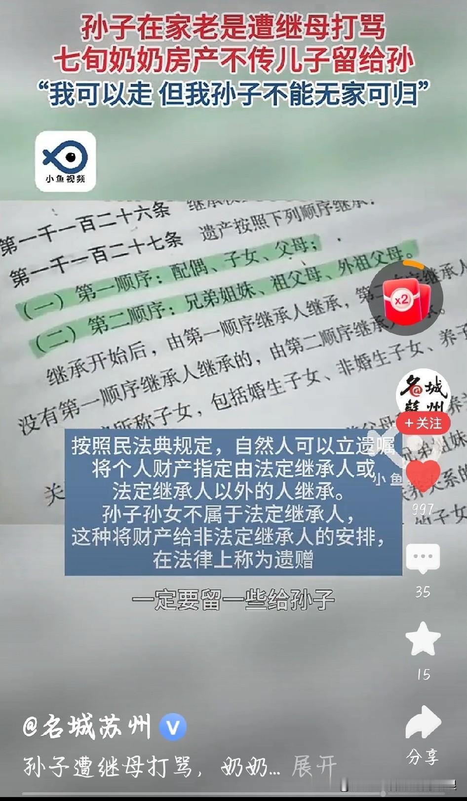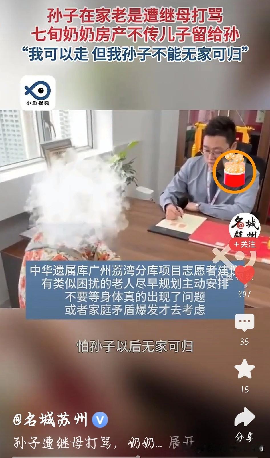 广州何阿姨这事儿看得我心里又酸又解气!孙子从1岁起就是她带大的,现在15岁了,还总遭继母打骂。 找儿子说理,他要么和稀泥,要么装听不见,生怕得罪现任妻子。老人年纪大了,最怕自己走后,孙子连个遮风挡雨的地方都没有。 干脆立遗嘱,把名下唯一的房子直接给孙子,越过了亲儿子。这哪是绝情啊,分明是无奈又明智的护犊!房子是死的,可这份疼孙子的心是真的。为人父母的,要是连自己孩子都护不住,还有啥资格谈亲情?孙子遭继母打骂 奶奶房产传孙不传儿 奶奶房产传孙不传儿 奶奶的爱 图片截图于名城苏州