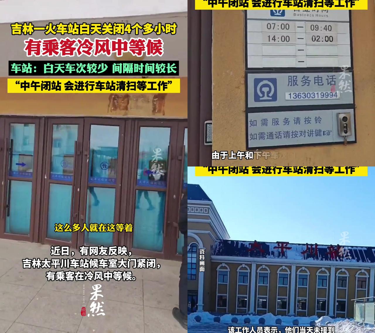 冬天等火车的痛,谁懂啊! 到了站门口,门居然锁得严严实实,冷风呼呼往脖子里钻! 吉林太平川车站就这么干了,白天闭站4个多小时,乘客在外面冻得直搓手。 工作人员说,一天就十几趟车,多是夜车,营业时间7点到9:40,下午2点到次日2点,中间要清扫,所以闭站。 有人骂“清扫是借口,躲里面暖和才是真”,也有人怼“让领导去外面冻两小时,看他还讲规定不?” 冬天的风跟小刀子似的,哈气瞬间成白雾,手冻得连手机都划不动,哪怕留个侧门避避也行啊! 规定是死的,人能不能活一点?提前贴个大提示,别等乘客到了才被关在风里。 你们遇过这种按规定办事寒心的事吗?当时最想骂啥?