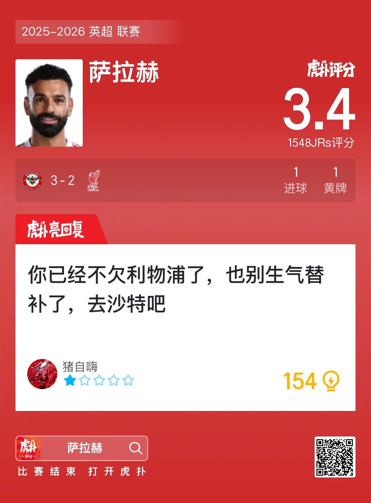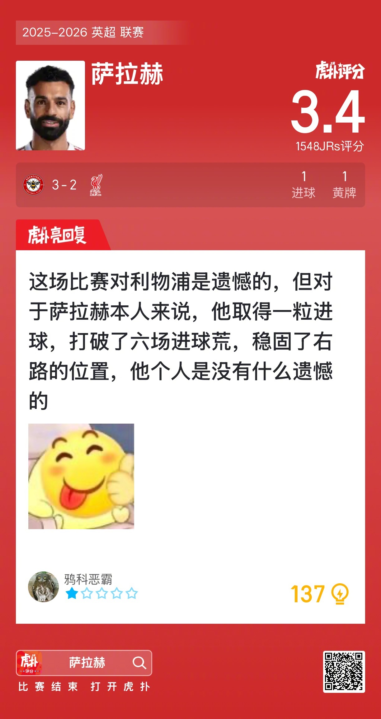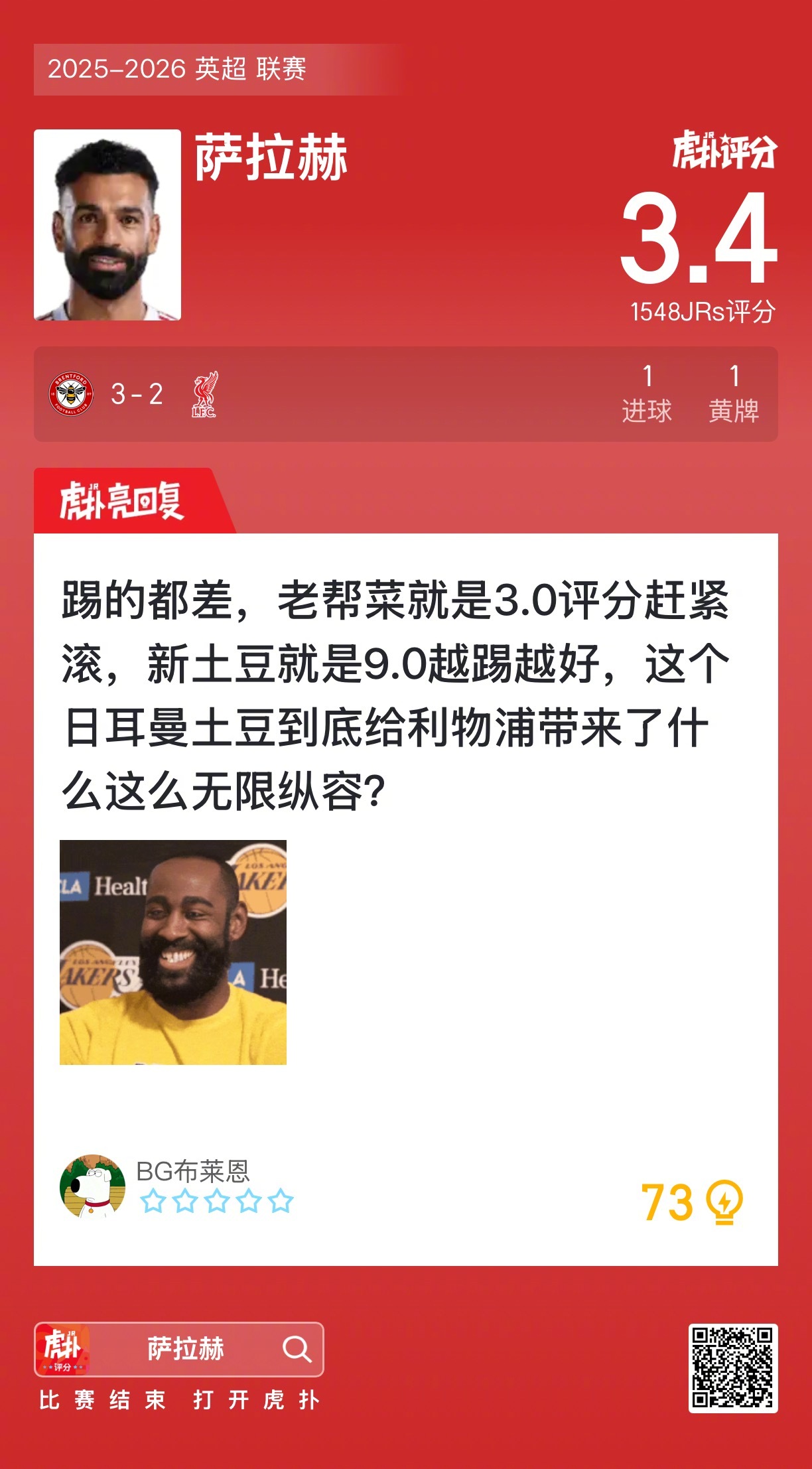 布伦特福德3比2利物浦萨拉赫打进一球,吃到一张黄牌,赛后收获3.4的虎扑评分!