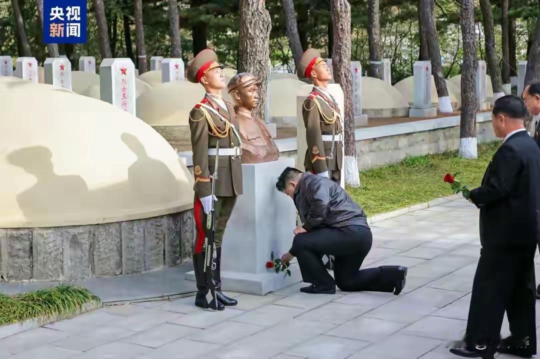 朝鲜领导人拜谒志愿军烈士陵园[祈祷] 10月25日,是中国人民志愿军抗美援朝75周年纪念日。 朝鲜国家领导人金正恩拜谒位于朝鲜平安南道桧仓郡的中国人民志愿军烈士陵园,向烈士们表示崇高敬意。 画面中,金正恩单膝跪地,低头沉思,面向长眠于此的烈士墓地 这一跪,是对75年前抗美援朝的志愿军烈士的缅怀与致敬,也是对“用鲜血与生命凝结的中朝友谊”的体现。 抗美援朝战争中,197653名年轻的志愿军,永远长眠在了朝鲜那个最寒冷的冬天,长眠在了异国他乡。 志愿军烈士们,你们的流血牺牲,换来了祖国和朝鲜的和平与安宁,你们值得被中朝两国人民永远铭记![祈祷]