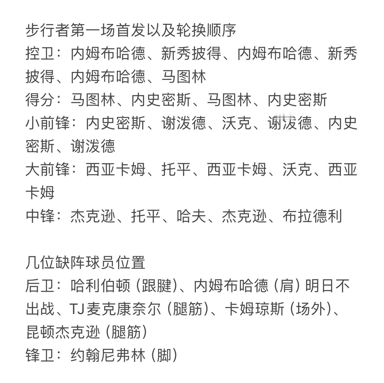 步行者记者:步行者队今天在孟菲斯对首发阵容进行了调整——詹姆斯怀斯曼担任中锋(本谢泼德取代内姆哈德(上场受伤没打,所以203cm的谢泼德担任控球后卫)。