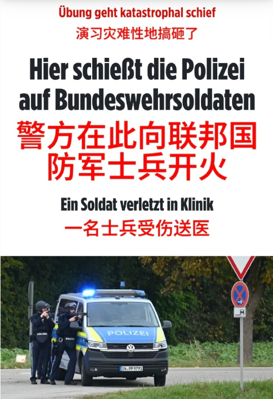 德军士兵发现警方逼近后,误以为是演习环节,果断开火!(只能听响没有弹头的演习弹药),德国警察却误以为“不明武装分子开火”,果断用实弹还击!一名德军士兵被警方实弹打伤。