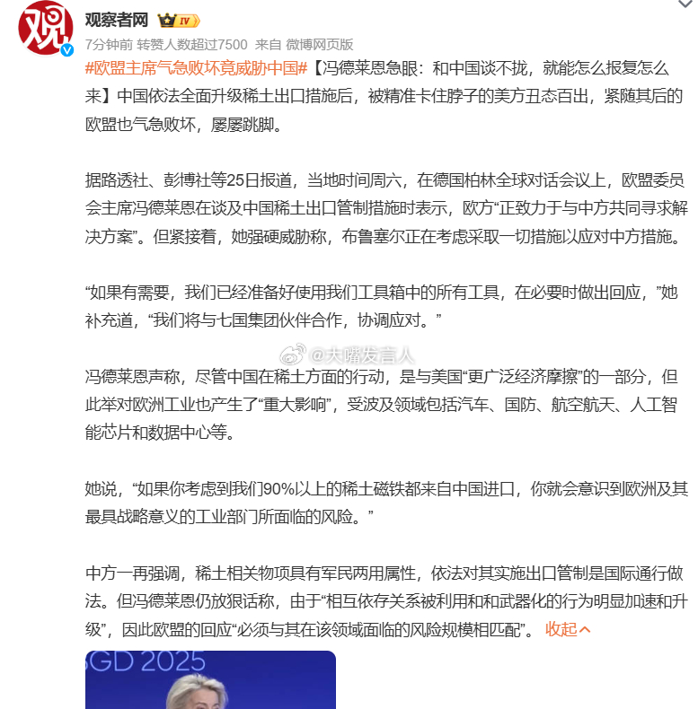 欧盟主席气急败坏竟威胁中国 冯德莱恩吗?类似于对岸赖皮德吧,都是裸官之类,内心是捍卫阿米的利益的[哼][哼]