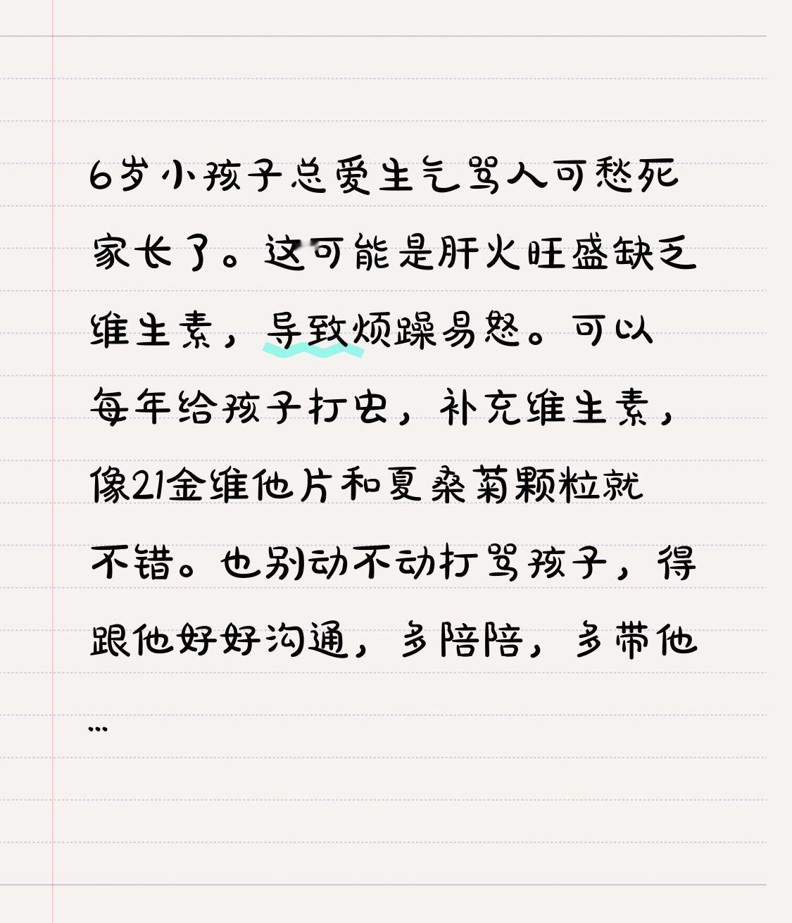 6岁小孩子总爱生气骂人可愁死家长了。这可能是肝火旺盛缺乏维生素,导致烦躁易怒。可以每年给孩子打虫,补充维生素,像21金维他片和夏桑菊颗粒就不错。 也别动不动打骂孩子,得跟他好好沟通,多陪陪,多带他和小朋友交流。孩子发脾气时,试试“3步冷静法”。别像浇冷水似的制止他,要先“接住”情绪,让他知道你懂他。比如玩具被抢哭闹,就蹲下来抱住说“妈妈知道你生气委屈”;想喝饮料没被允许摔东西,就轻声说“没喝到不舒服才摔东西”。共情之后再处理问题,慢慢就能养出好脾气。