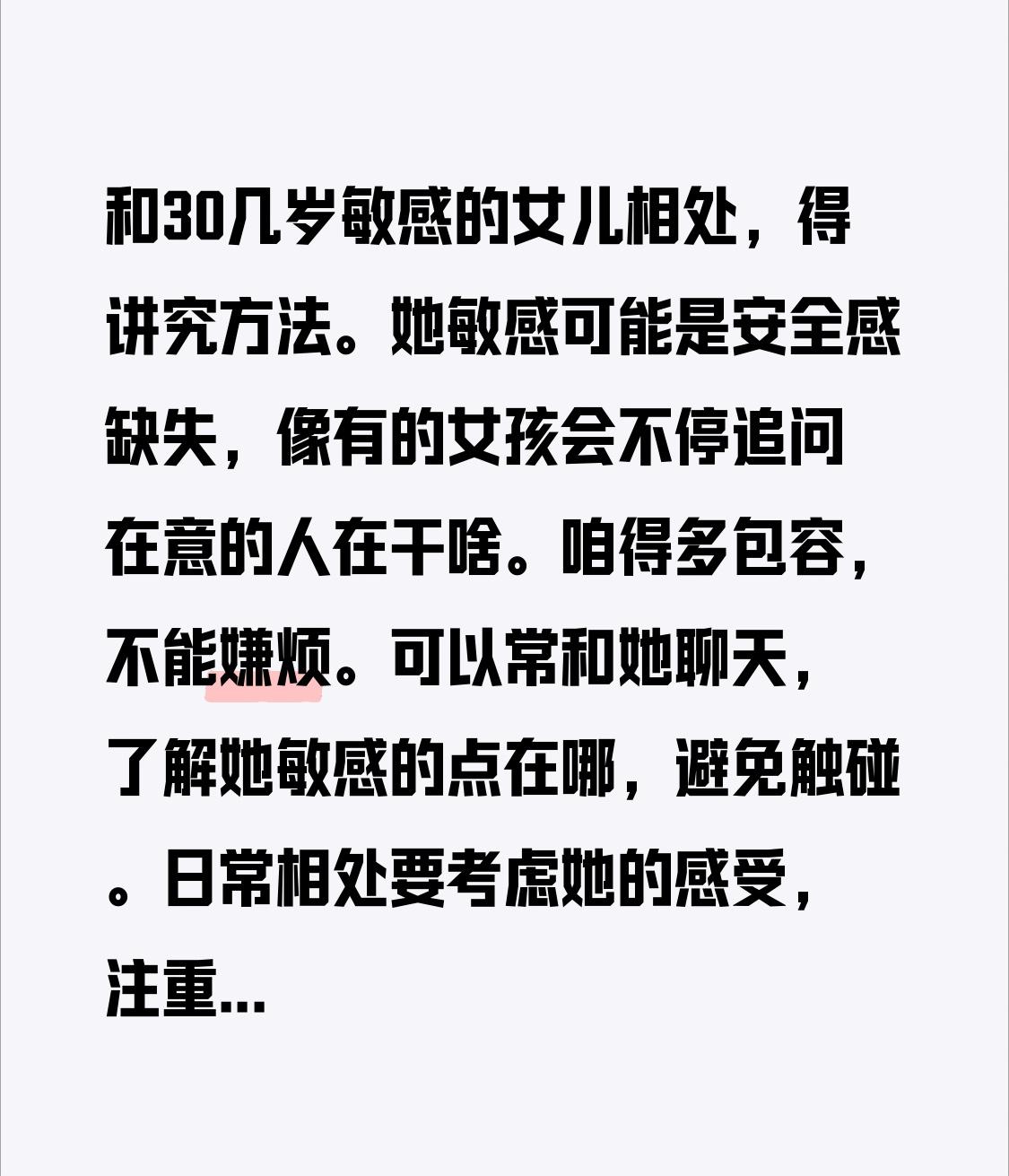 和30几岁敏感的女儿相处,得讲究方法。 她敏感可能是安全感缺失,像有的女孩会不停追问在意的人在干啥。咱得多包容,不能嫌烦。可以常和她聊天,了解她敏感的点在哪,避免触碰。 日常相处要考虑她的感受,注重细节。说话温柔体贴些,别太直接粗暴,给她营造安全舒适的环境。当她多愁善感时,告诉她你会一直在。也能陪她听听音乐、户外走走,转移下注意力,缓解心理压力。开放沟通也很重要,有问题和平解决,一起建立深厚的情感连接。