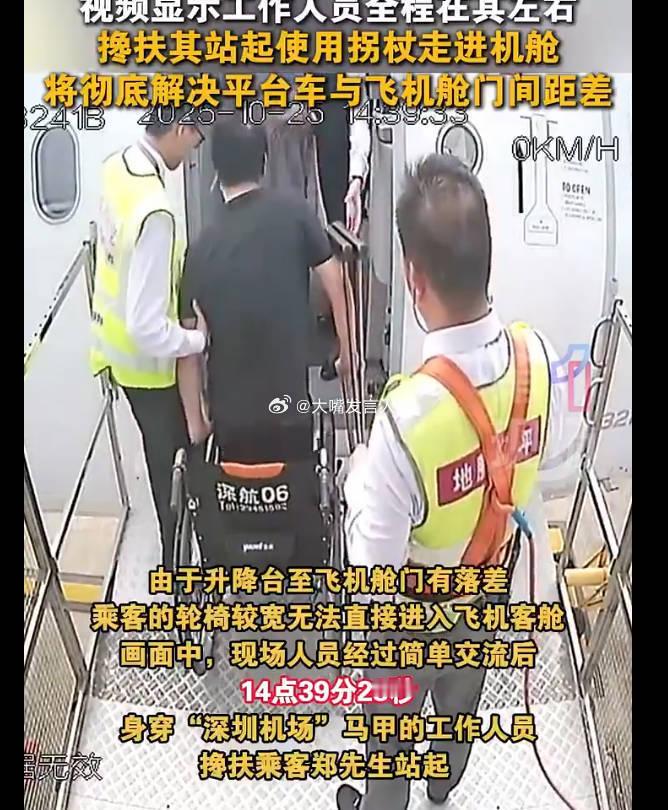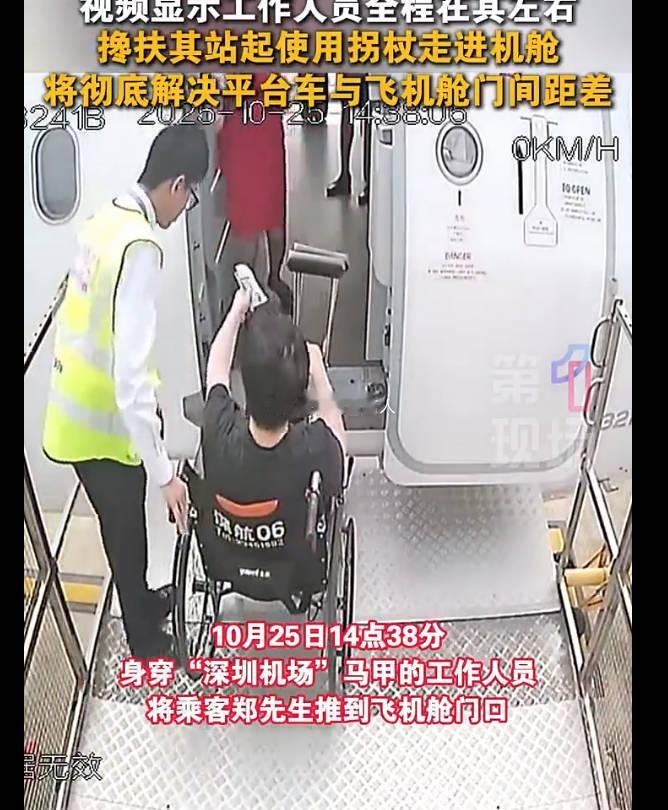 郑先生描述的“连滚带爬”,好像与视频中进机舱门的这一幕不太相符呀,为什么视频中有两位机场服务人员在其身旁,一边帮扶着他进机舱,甚至伏身帮他搬腿,既没看到他“滚”,更没看到他“爬”呀[疑问][疑问][疑问]