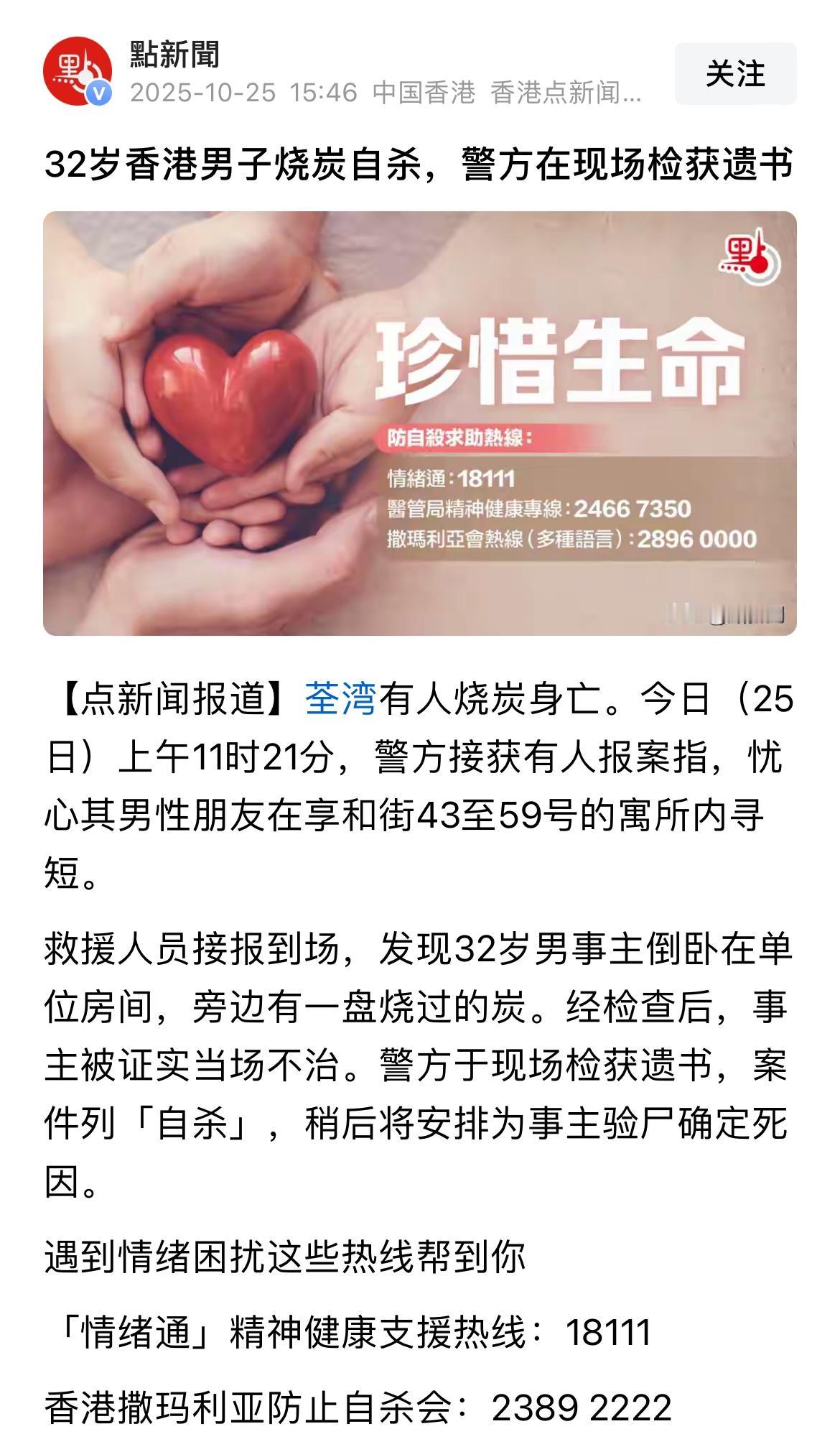 香港又有年轻男子轻生身亡,10月25日,荃湾一名32岁男子在寓所烧炭自杀,现场留有遗书,今年香港的凶案和自杀案件真有些频繁,让人费解,要知道香港可是多少人向往工作生活的地方,至少想干活都有工作可做吧,为何还那么多人不珍惜呢!