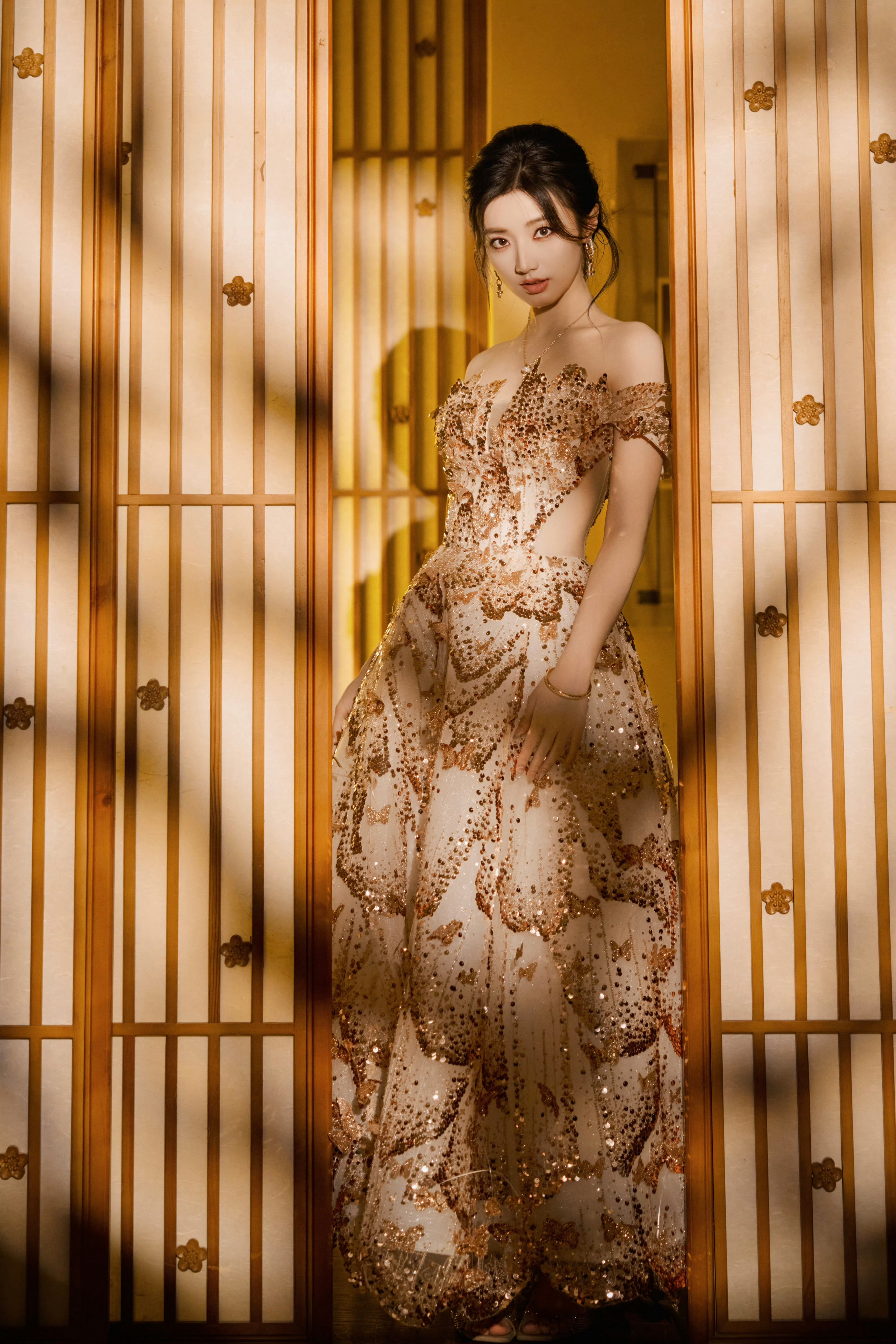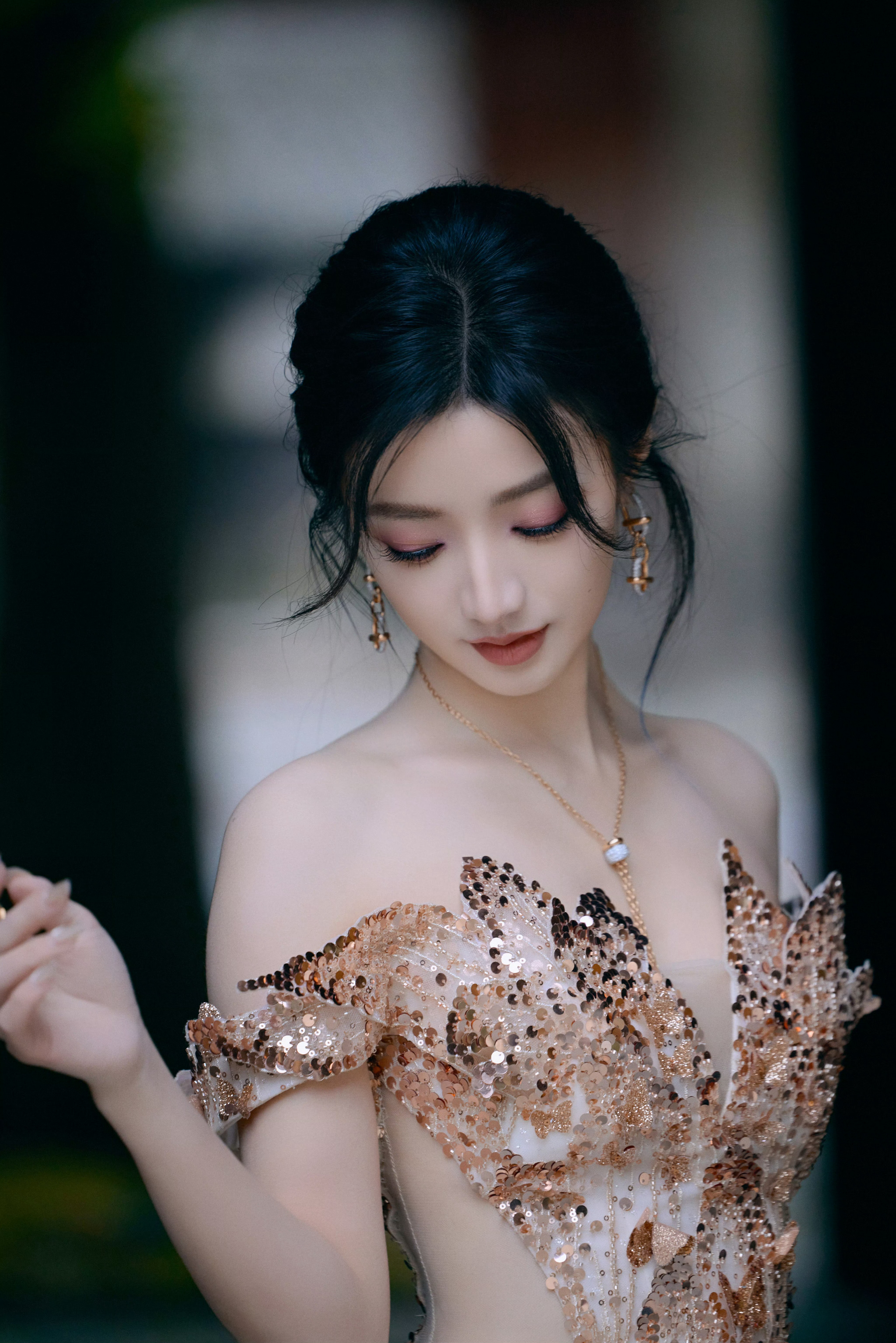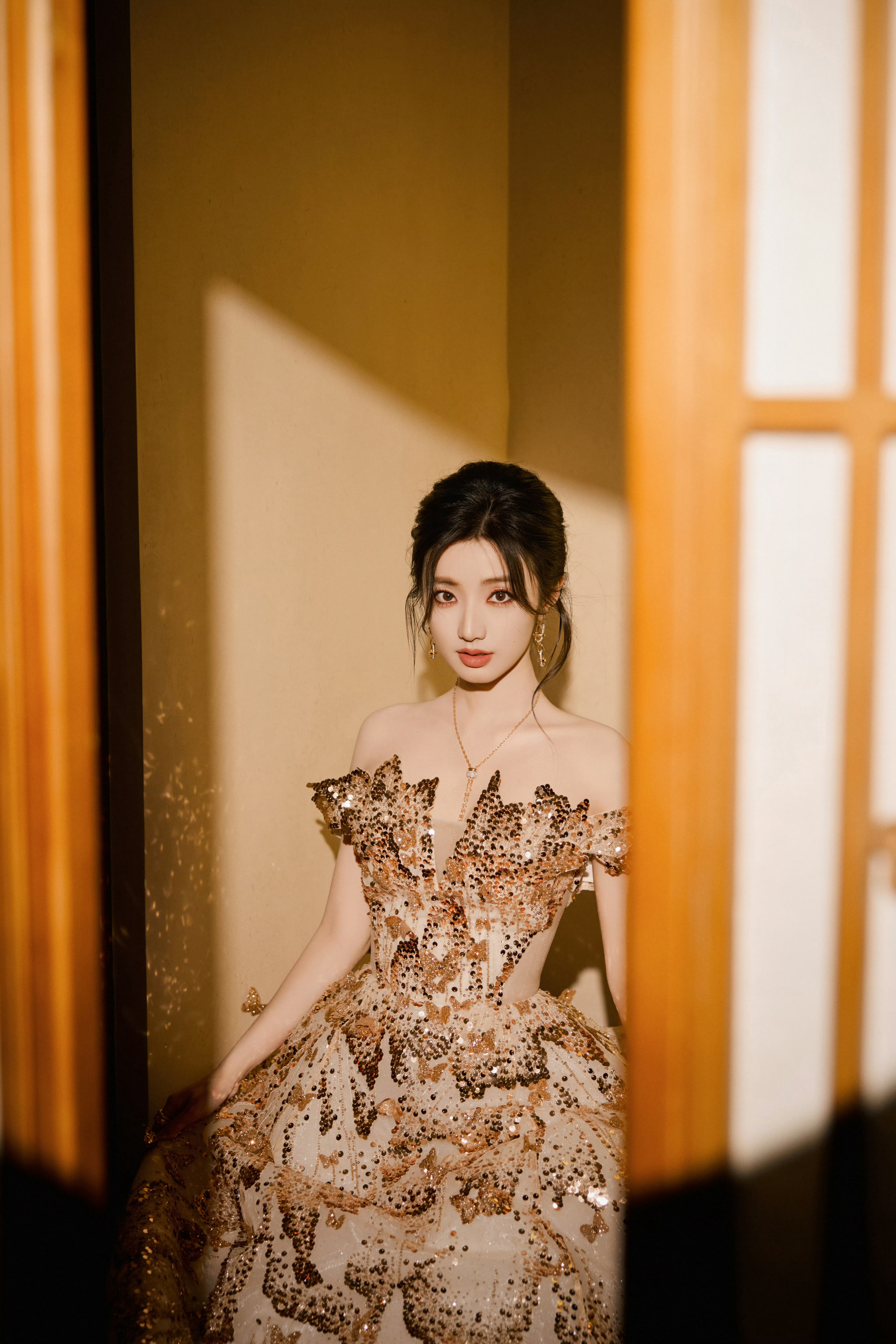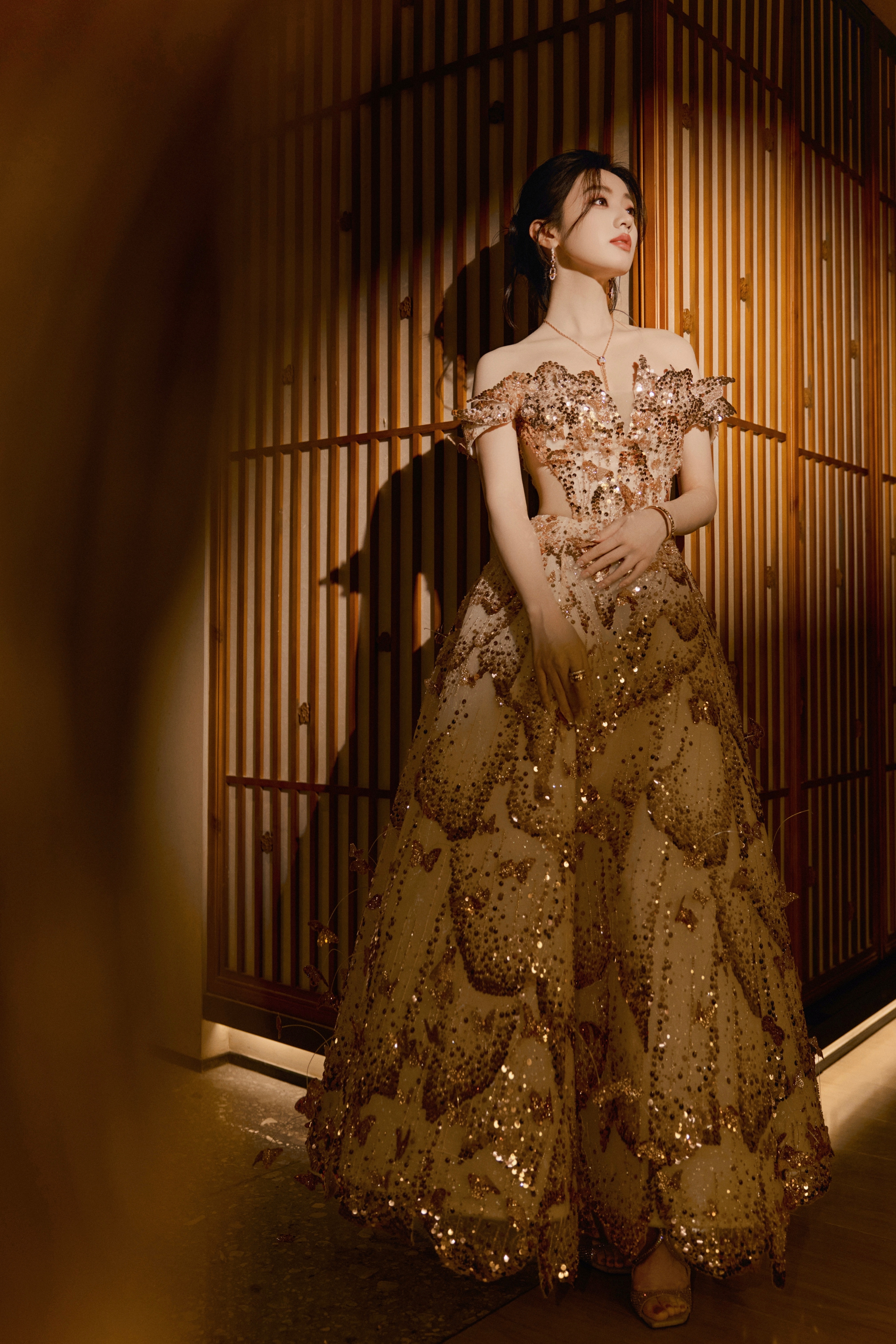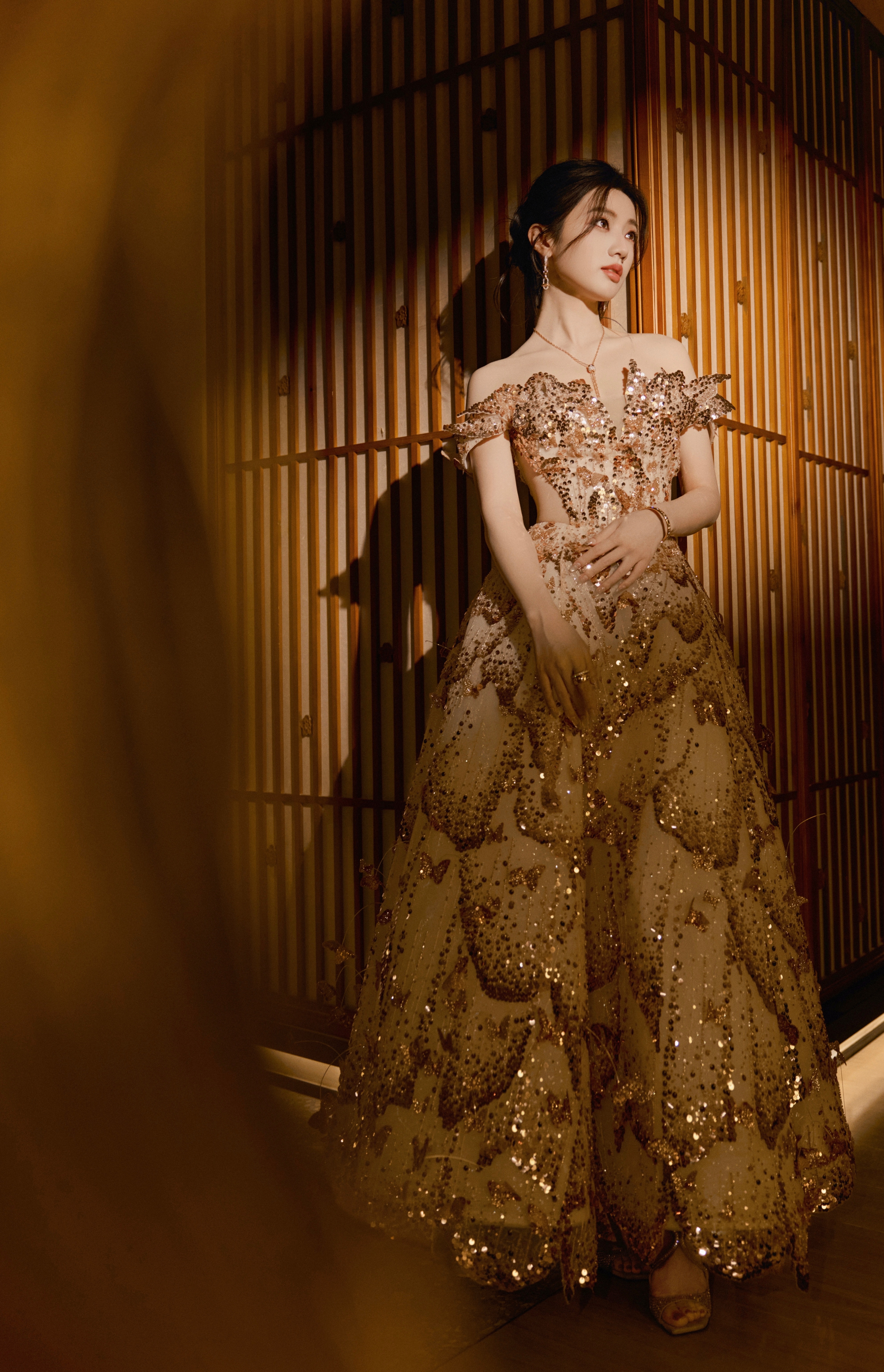 荣获新势力高光演员奖 ,造型很绝哦 !金色亮片交织蝴蝶纹样的露肩礼服 ,玫瑰金流光里满是华丽氛围感 ,一整个亮眼又高级 !精致盘发衬得肩颈线条超绝 ,金饰项链 、手镯与礼服的闪片呼应得恰到好处 ,每一处细节都把优雅贵气拿捏得死死的 ,同时又还带着灵动的闪耀感 ,属实让人移不开眼 ,美之爱之 ,也期待美女后续越来越好咯 ~ [抱一抱]