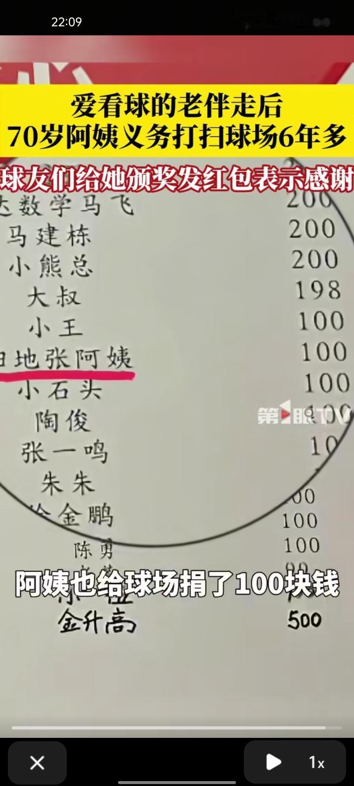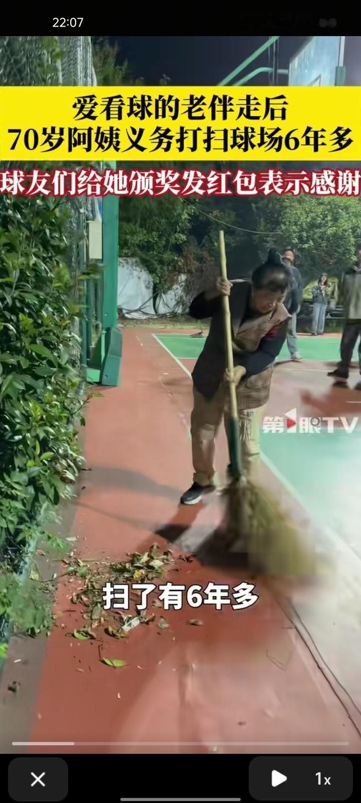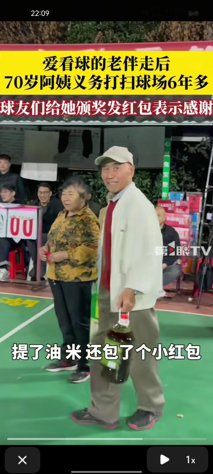 10月23日,金华东阳市。网友发视频称,七旬阿姨在球场义务扫地,持续六年多。她老伴生前非常喜欢看球,老伴离开了,阿姨就到球场扫地,可能是寄托她的感情,球友们给她颁奖发红包表示感谢,阿姨也给球场捐了100元,非常值得尊重。