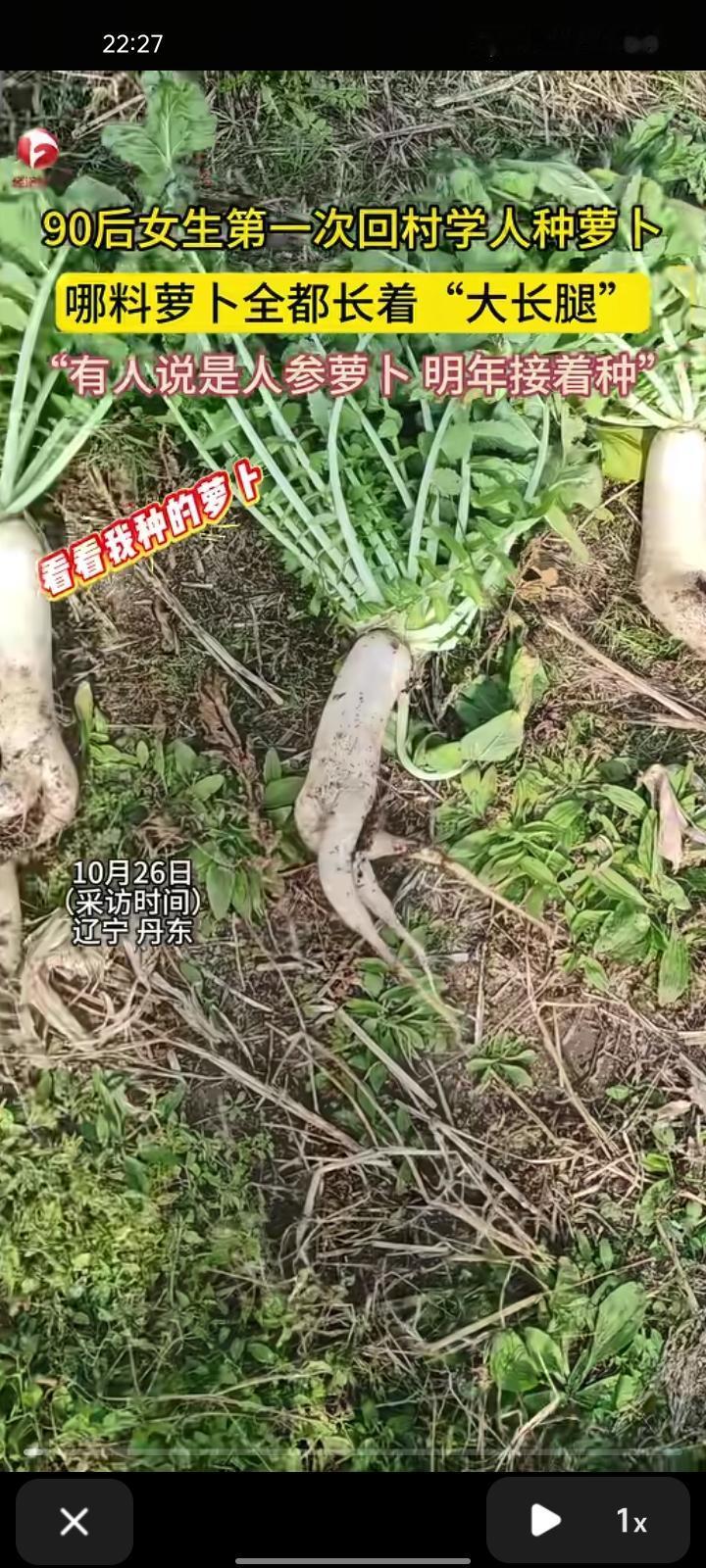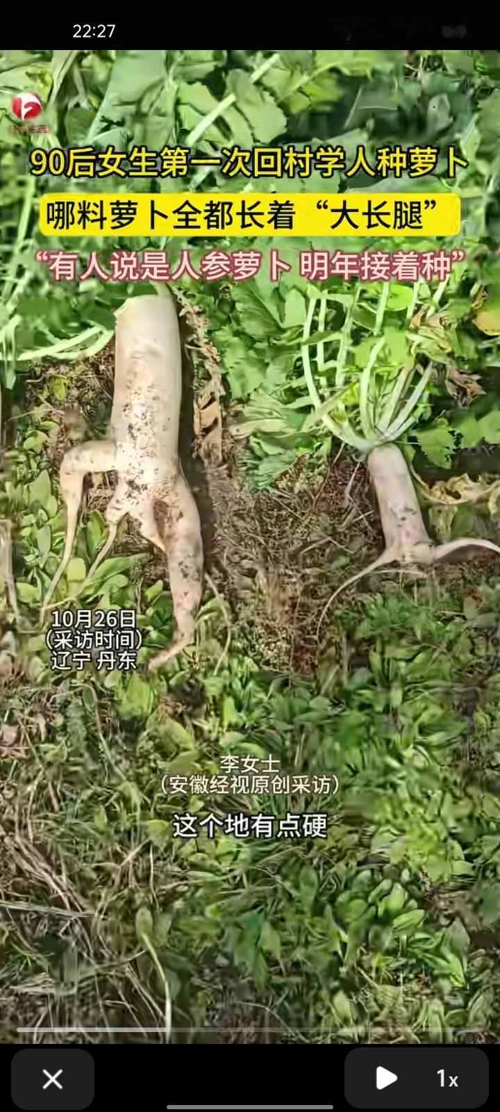 10月25日,辽宁丹东。女子晒视频展示自己的萝卜,这还是第一次学种萝卜,哪料萝卜全部长着“大长腿”。看着很有意思,有人说是人参萝卜,明年接着种
