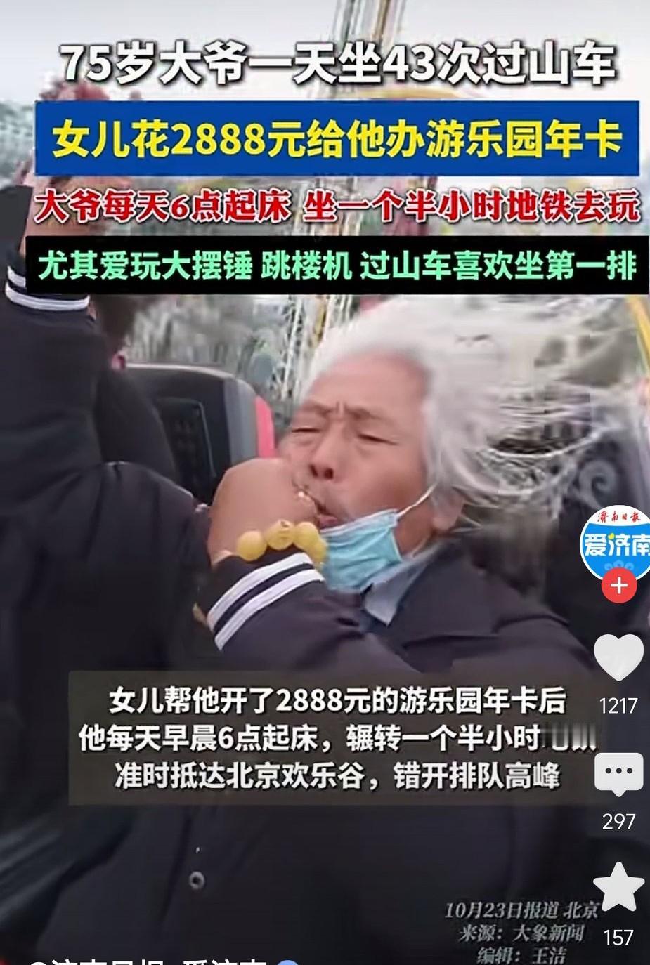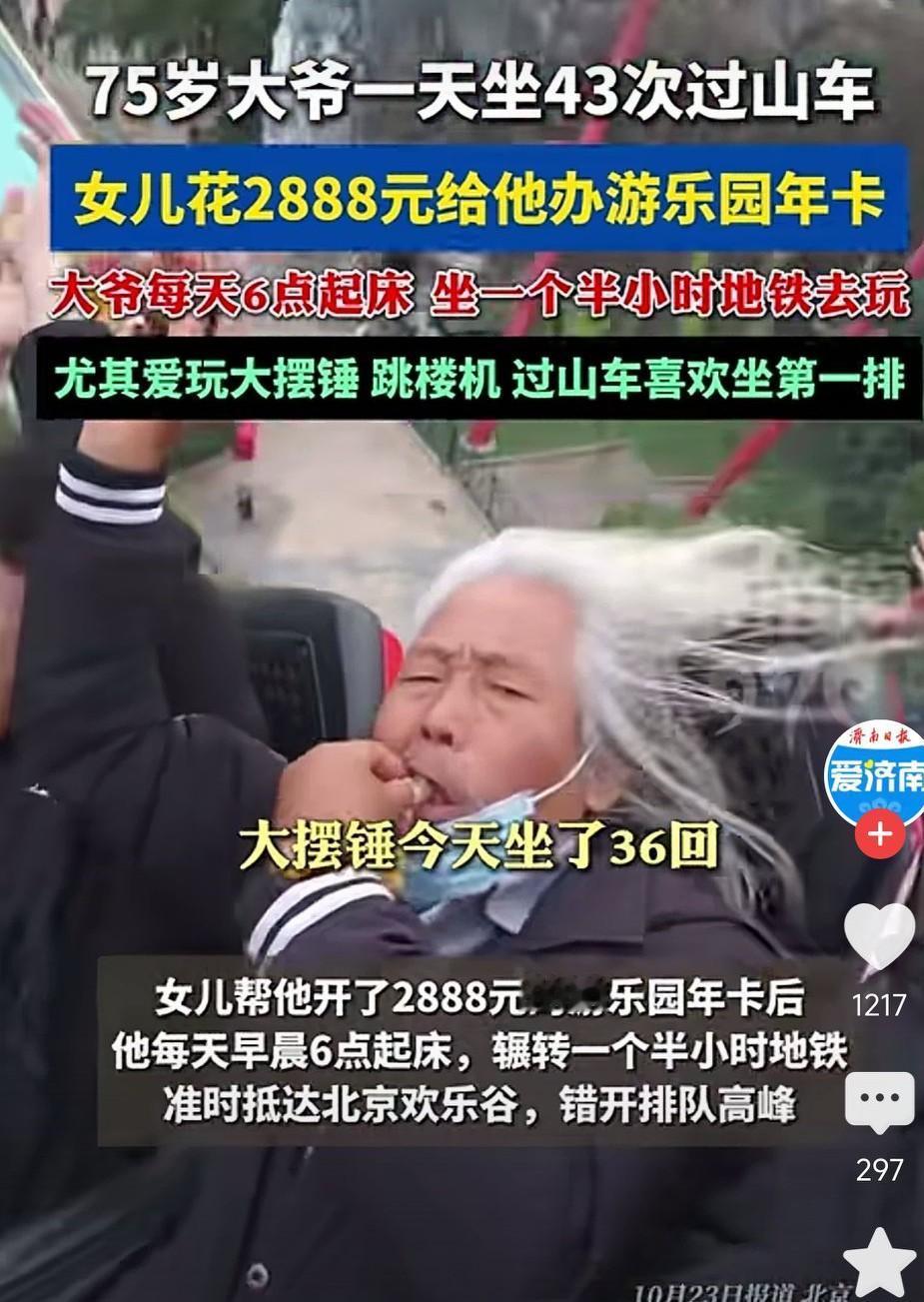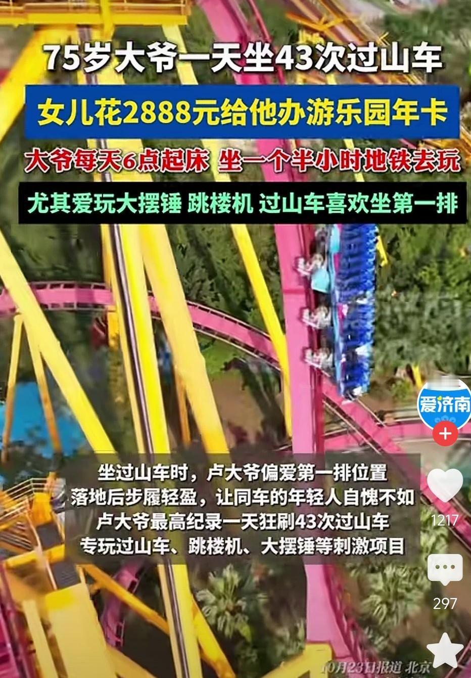 北京75岁大爷一天狂刷43次过山车? 这个乐园胆子这么大吗? 据说女儿帮他开2888元乐园年卡,大爷每天6点起床乘一个半小时地铁去游乐园。 我真的非常怀疑这个信息的真假! 正常的游乐园,刺激项目是不允许70周岁以上体验的。像过山车、大摆锤这些,甚至控制65周岁以下! 2888元,万一老爷子出了问题,游乐园要赔几百万! 这生意老头家人稳赚不赔啊,游乐园也是胆子大,这都让坐? 严重怀疑这新闻的真实性! 如果这游乐园是我开的,我可不让大爷来坐! 三千块不挣也罢,主要担不起这风险! 过山车安全吗?