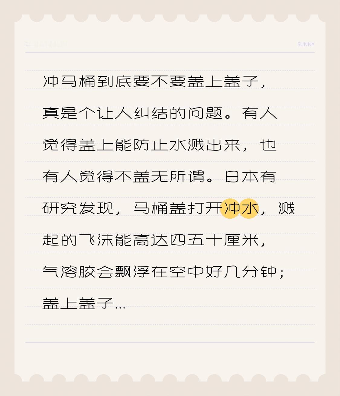 冲马桶到底要不要盖上盖子,真是个让人纠结的问题。有人觉得盖上能防止水溅出来,也有人觉得不盖无所谓。日本有研究发现,马桶盖打开冲水,溅起的飞沫能高达四五十厘米,气溶胶会飘浮在空中好几分钟;盖上盖子,气溶胶虽会从缝隙释放,但不会向上扩散,1微米以下气溶胶数量只有打开时约四分之一。不过,北京师范大学的实验却有不同结果,检测3分钟和6分钟时,打开马桶盖的菌落数总和都比合上时少。看来这事儿不能一概而论,为了保险起见,盖上盖子冲马桶或许更安心点。