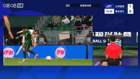 北京国安vs青岛海牛比赛56分钟,李磊禁区内撞倒韦所为送点,萨里奇主罚一蹴而就