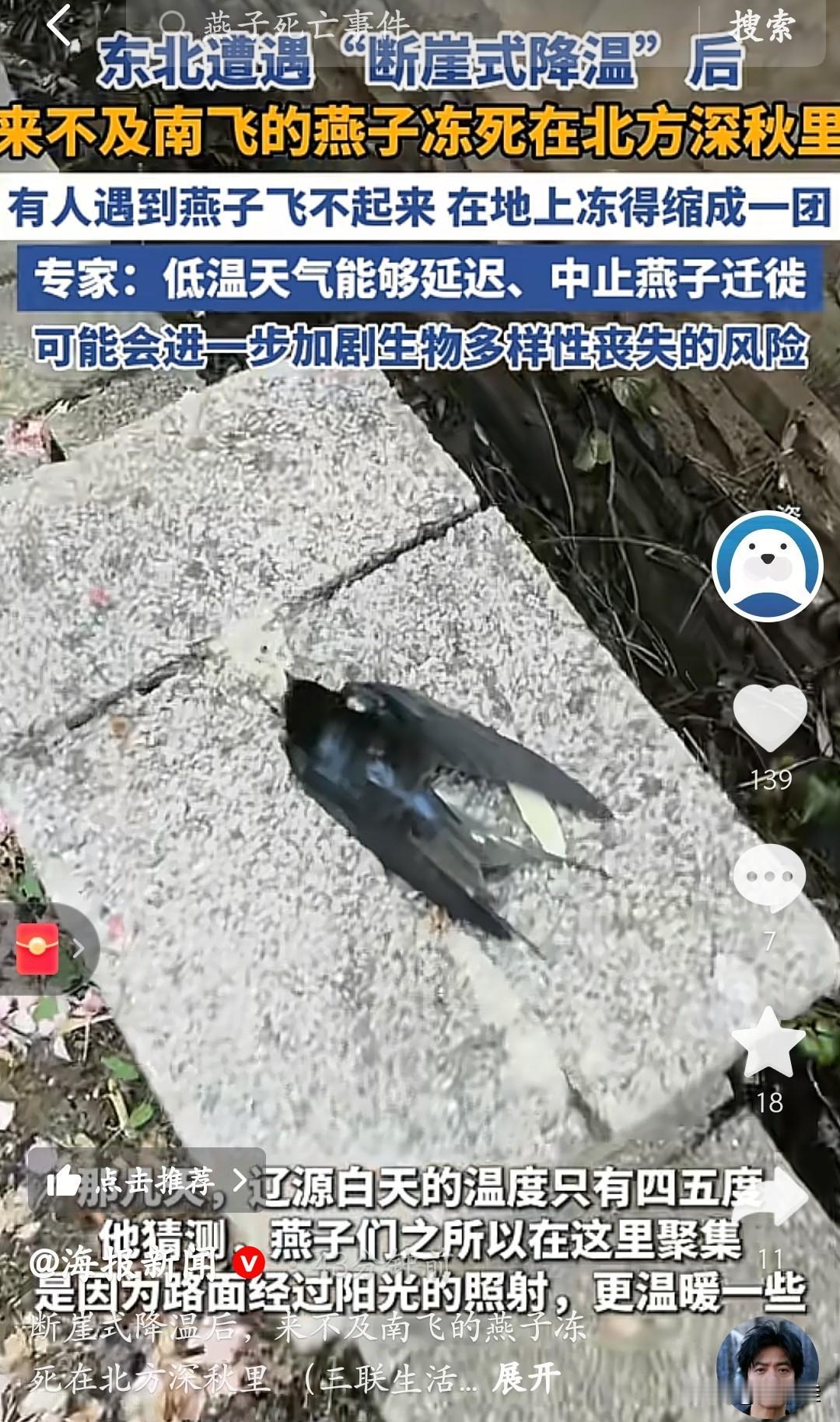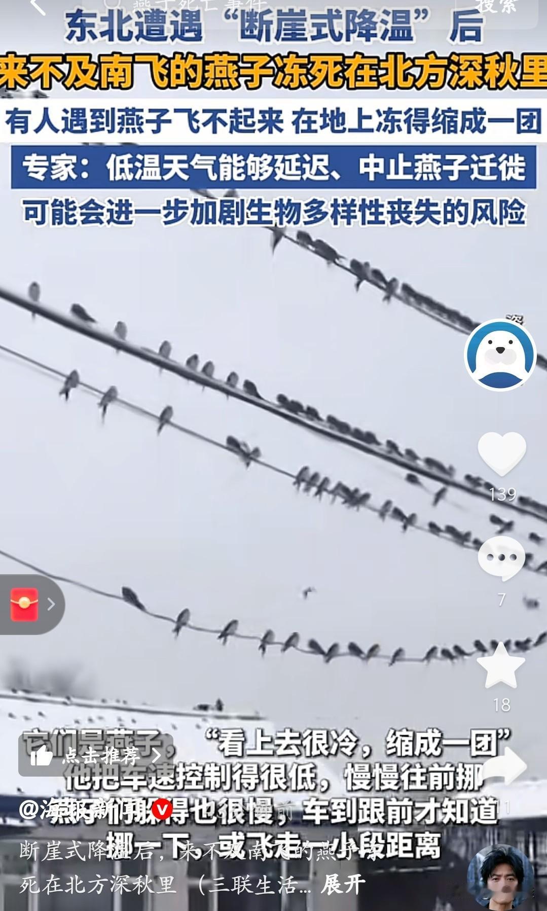 东北的天气今年可太反常了——前阵子还是暖烘烘的秋,说降温直接“断崖式”往下掉,雪片子都飘下来了。这可苦了没来得及南飞的燕子,本来该往南边躲寒,结果让这冷劲儿打了个措手不及。 你看那路上,燕子冻得缩成一团,翅膀都扇不动,有的直接僵在石头上没了气儿。往年这时候燕子早都飞走了,今年这天气跟“抽风”似的,把这些小家伙全给坑了。 这天气反常得越来越邪乎,不光人遭罪,连鸟儿都跟着受连累!