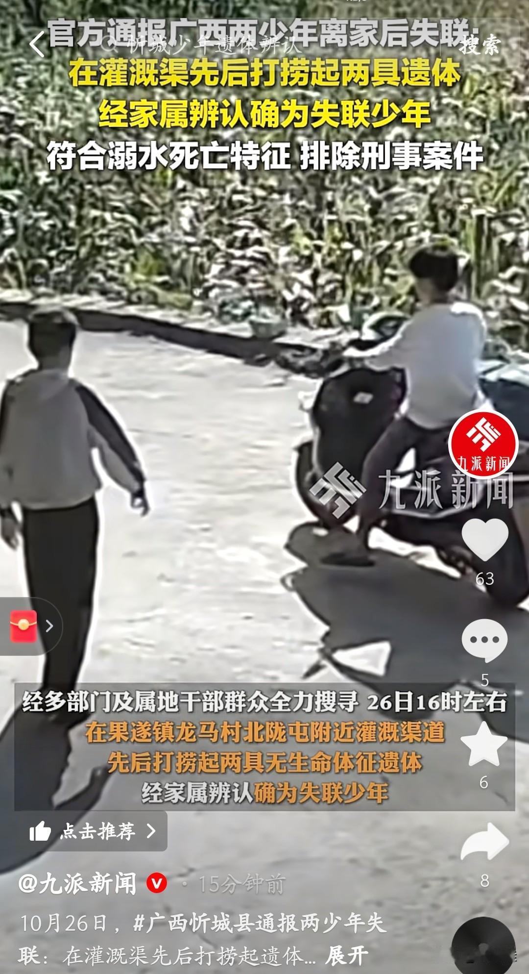 广西走失的两个少年找到了,可惜啊,找到的只是两具尸体。 10月25号俩孩子离家后没了信儿,全家急疯了,村里、部门的人全出去找。结果26号下午在灌溉渠里捞上来两具遗体,家属认了,就是这俩娃。 警察说符合溺水特征,不是啥刑事案件,好好的孩子说没就没了。 很有可能一个落水,另一个去施救,结果双双溺水身亡了。