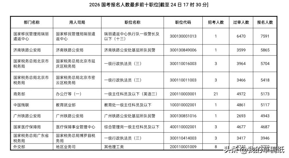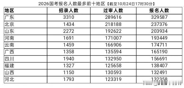 国考报名破纪录!371.8万人竞逐3.8万职位,最热岗位7591人抢1席! 2026年度国家公务员考试报名刚刚落幕,报考热度再创历史新高!据国家公务员局公布,今年通过资格审查人数达371.8万人,平均98人竞争1个岗位,而招录总人数为38119人,较去年缩减1602人。 竞争最激烈的桂冠由国家移民管理局瑞丽遣返中心执行队一级警长及以下职位摘得,仅招1人,却吸引7591人报考!该岗位因要求“教育学类本科、限女性、无基层及户籍限制”成为“万人迷”。 地域报考数据显示,广东地区报名人数32.9万,领跑全国;北京则以165.5:1的竞争强度成为“最难考区”。 今年国考政策迎来重要调整:报考年龄放宽至38岁,应届硕、博更放宽至43岁,为更多人才打开大门。 千万人同行,挤上这座独木桥——是理想还是现实?这场“编制争夺战”背后,映照出当代年轻人对职业选择的思考与时代的回响。