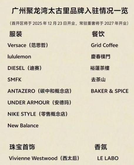 【广州太古里进驻品牌曝光】继续荔湾山姆会员店宣布年底开业之后,现在荔湾的另外一个大商业聚龙湾太古里首批进驻的品牌疑似在网上流传! 可以看到进驻品牌包括范思哲、lululemon、DIESEL(迪赛)、SMFK、ANTAZERO、UNDER ARMOUR、NIKE STYLE、New Balance等服装品牌,另外餐饮类则有Grid Coffee、慶春樸門、裕蓮茶樓、去茶山、BAKER & SPICE等。 好吧,像小编这种穷人,也就是听过范思哲、NIKE、New Balance等,其他的真的是没听过,不知道大家觉得这个太古汇在广州的第二店满不满足土豪们的期待了? 爆料称聚龙湾太古里首开区将于12月23日开业,常驻重奢将于2027年开业。而常驻重奢大概率是指爱马仕、LV这类。而和太古汇的盒子类商场不同,根据太古里项目负责人公开表示,顶级重奢品牌会在江边、河涌旁打造独栋旗舰项目。