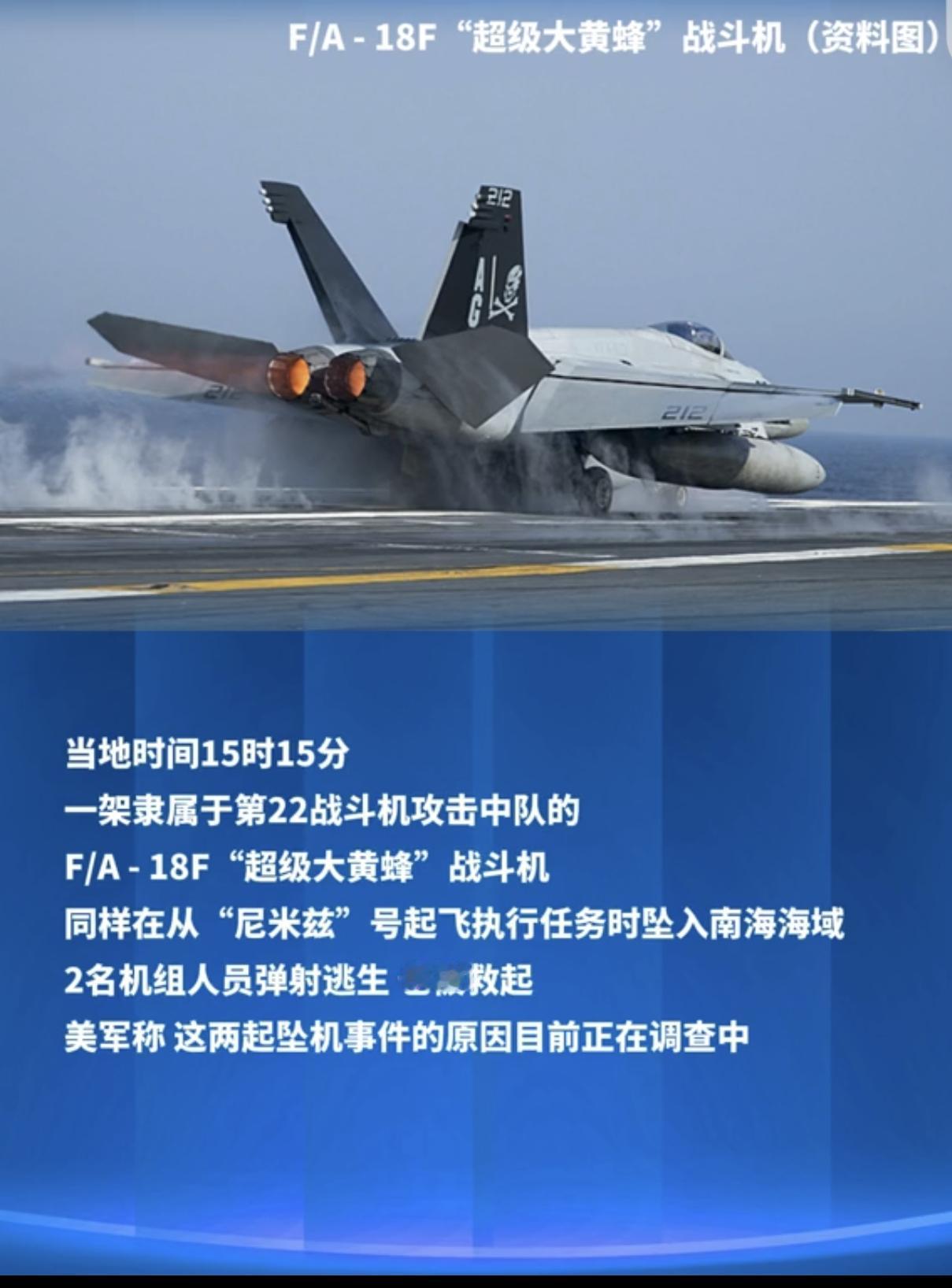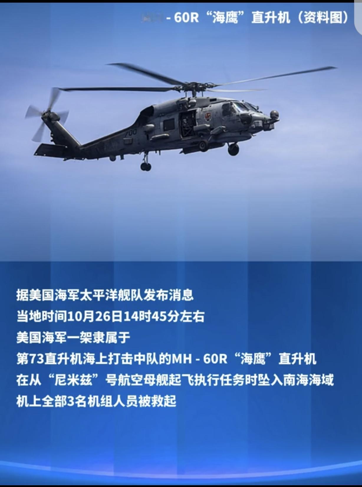 根据美国海军太平洋舰队发布的消息,当地时间10月26日下午2点45分左右,坠毁的是美国海军一架隶属于第73直升机海上打击中队的MH-60R“海鹰”直升机,而非MH-62,事故发生在从“尼米兹”号航空母舰起飞执行任务时,机上全部3名机组人员被救起 。 此外,当地时间下午3点15分,一架隶属于第22战斗机攻击中队的F/A-18F“超级大黄蜂”战斗机同样在从“尼米兹”号起飞执行任务时坠入南海海域,2名机组人员弹射逃生也被救起 。美军称,这两起坠机事件的原因目前正在调查中 。