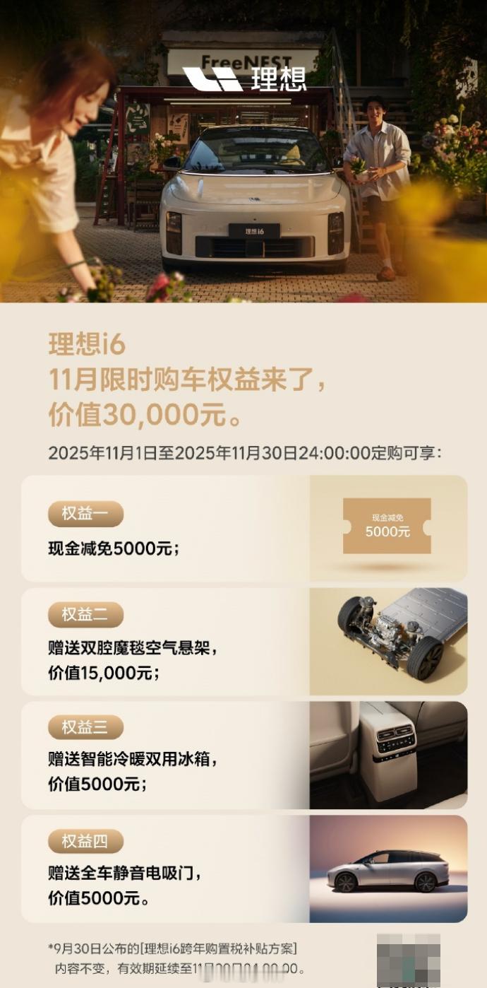 理想 i6 的 11 月限时购车权益公布了,继续送空悬、冰箱、电吸门,现金减免比这个月少了五千,购置税补贴仍然有,延期到 11 月 30 日。