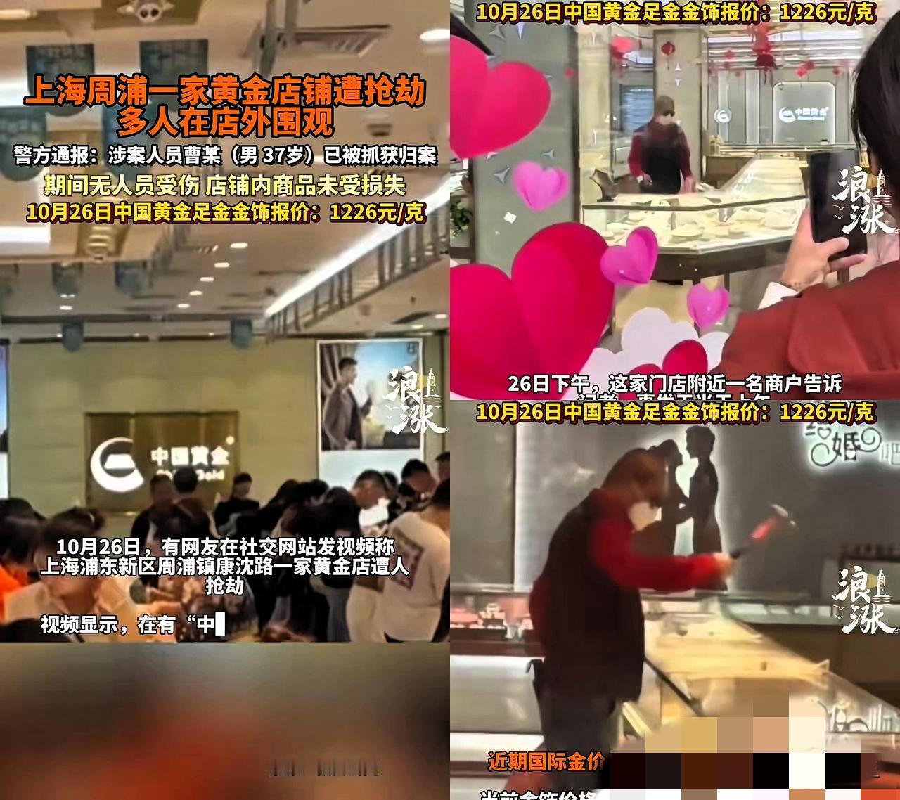 上海这起金店闹剧,看完心里堵得慌! 10月26号上午,周浦那家中国黄金店里,37岁的曹某拿着东西砸柜台,左手提个空袋子,砸完就站着不动,保安过来不跑,民警到了直接被抓,表情平静得吓人[__LINK_ICON]。 要知道当天中国黄金金价1克1226元,真要抢早把金饰往袋里塞了,可他连商品都没碰,分明是求着被抓。 网友猜他是压力太大撑不住,想靠进局子换口热饭、睡个踏实觉,这猜测透着心酸。 37岁正是扛事的年纪,得被逼到多绝望,才会选这种最笨的办法?这哪是抢劫,分明是成年人崩溃到极点的求救信号。 但再难也不该碰法律红线啊,总有比“自投罗网”更体面的出路。你说要是遇到跨不过的坎,除了喝酒、躲起来哭,还有啥办法能撑过去?