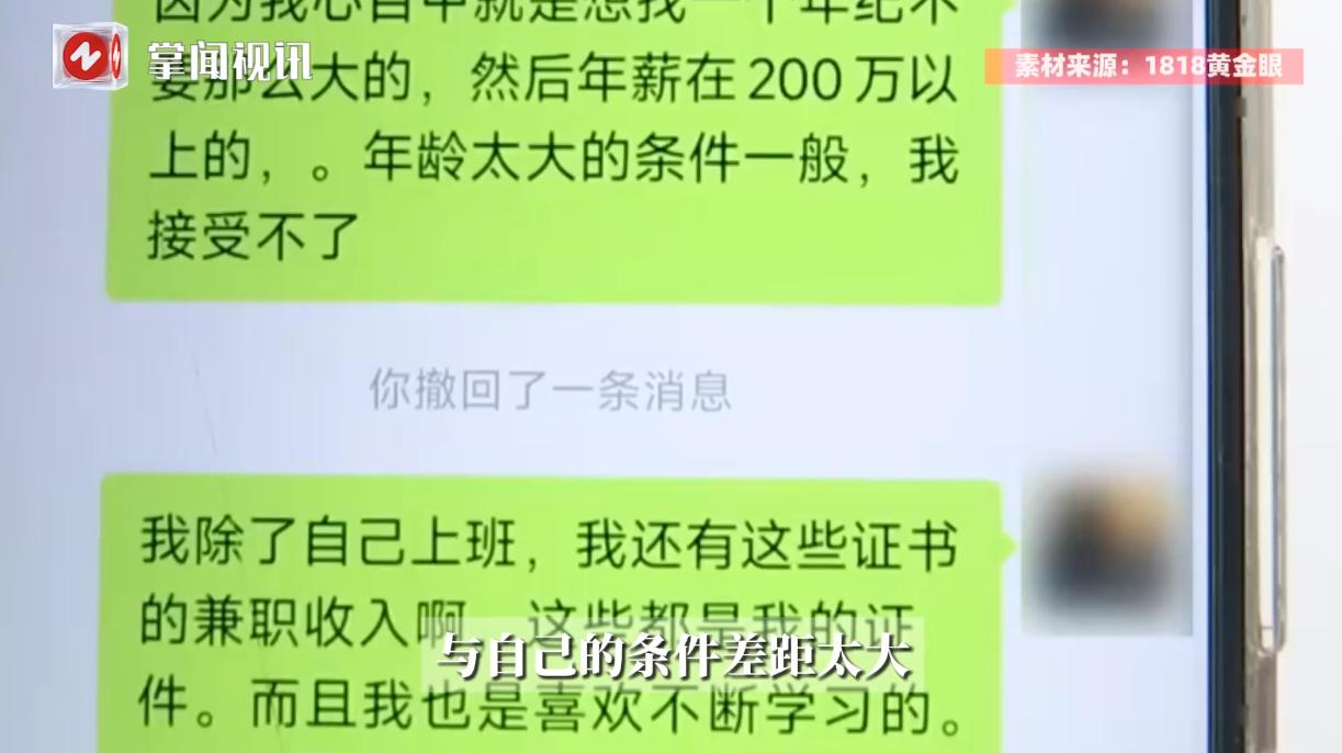 近日,浙江杭州,一27岁女子为了能找到心仪对象,在婚介公司花了60000元,没想到公司却给她介绍50多岁的男性,这让她无法接受,要求婚介公司退钱,可公司却表示女子的要求是200万以上年薪,年轻一点的男子要求都很高,女子反而可能匹配不上! 麻烦各位读者点一下右上角的“关注”,留下您的精彩评论与大家一同探讨,感谢您的强烈支持! 杭州一位事业有成的单身女性。她选择婚介公司,既是想为自己的感情生活增添一份确定性,也希望借助专业资源,找到理想中的人生伴侣。 她的标准很明确:对方年龄不能太大,最好长相过得去,在本地有房有车,年收入还要达到两百万甚至更高。 为了这份“美好期许”,她毫不犹豫地交出了六万多元服务费,合同上白纸黑字,承诺三个月内必须介绍三位人选。 可现实总是比想象骨感得多。花了高价,等来的却是一次次失望。女子发现,婚介公司安排见面的男士,年龄偏大,条件远不及自己的预期。 甚至有的男士只需交几千元会费,和她高昂的投入形成鲜明对比。一次偶然的聊天,她发现某男士每次见面只需交1500元,顿时怀疑对方是“婚托”,这让她对婚介公司的诚信产生了极大质疑。 她不是没有努力配合,也坦言自己择偶标准高,但在几次相亲下来,发现现实与宣传严重不符。甚至有人自报年薪四百万,深入了解后却不过一百万出头。 婚介公司则解释,高收入、年轻且有房有车的男性,本身就不愁找对象,他们择偶标准也很高。面对女子的退费要求,婚介公司除了劝说继续匹配,态度坚决拒绝退款。 双方各执一词,矛盾一触即发。女子觉得自己是被骗了,钱花了,心也伤了,既没找到理想伴侣,连服务承诺都成了一纸空谈。 婚介公司则反复强调,女子的标准过高,市场资源有限,哪怕他们投入再大,也不能保证每一位客户都能如愿以偿。 这起纠纷在社交网络上持续发酵。有人觉得,女子本身条件不差,要求高一点很正常,毕竟谁不想追求更好的生活?也有人认为,市场上高净值单身男士本就稀缺,这样的人有资源和圈子,未必会靠婚介公司找对象。 甚至还有网友犀利调侃:“真正年薪几百万的优质男士,反而挑对象更苛刻,你拿什么和他们谈条件?”但更多人关心的是,婚介行业到底有没有虚假宣传、涉嫌“婚托”欺诈? 法律人士也给出了专业解读。只要合同明确约定了服务内容和标准,婚介公司就有义务兑现承诺。 如果介绍对象与合同明显不符,或者虚假宣传、存在婚托行为,消费者完全有权要求解除合同、讨回费用。但另一方面,婚姻本就是高度不确定的事情,择偶双方的主观期望和现实匹配度永远存在落差。即使婚介公司尽力筛选,也无法保证每一次介绍都能让人满意。 这场风波其实映射出一个更深层的问题:我们在追求爱情时,究竟该如何定位自己的期望?高价买服务能否买到真爱?是婚介公司服务能力有限,还是消费者期望本就过高?当金钱和情感交织,婚恋市场的信任感又该如何守护? 信源:《“要求年龄差10岁以内”,27岁女子交6万元相亲被介绍50岁对象,机构回应》——1818黄金眼