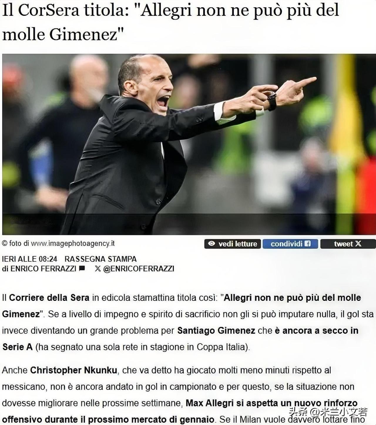 阿莱格里肯定了希门尼斯的作用,但对于希门尼斯一直无法进球,十分不满。阿莱格里预计在明年一月的冬季转会市场上会引进一名新的进攻球员。如果米兰真的想要争夺意甲冠军,他们就需要前锋的进球支持。锋线问题不能完全说是希门尼斯的问题,首先要说球队管理层评估问题。 恩昆库的购买是米兰管理层评估出了问题,恩昆库加盟时候阿莱格里就说过他不清楚恩昆库适合的位置,从阿莱格里表达看,恩昆库肯定不是阿莱格里提出的,而是管理层需要的,管理层肯定是希望恩昆库在米兰能重新找回德甲时期的状态,希望恩昆库可以成为普利西奇式交易,但现在看恐怕还是需要时间。其次就是阿莱格里战术制定,阿莱格里自己说过希门尼斯不是一名中锋,他是一名射手,既然知道他不是中锋,你把他放在中锋位置那就是教练战术布置的问题,个人觉得希门尼斯已经很好了,他不能发挥长板,但他没有迷茫,他在锋线积极跑动,帮助队友拉开空间,策应协防都面面俱到,我们不能对球员要求太多。 阿莱格里表示任何人在投入和牺牲精神方面无法指责希门尼斯,但他的进球问题却变得越来越严重,意甲中他依然没有进球,本赛季他只在意大利杯中打进了一球。