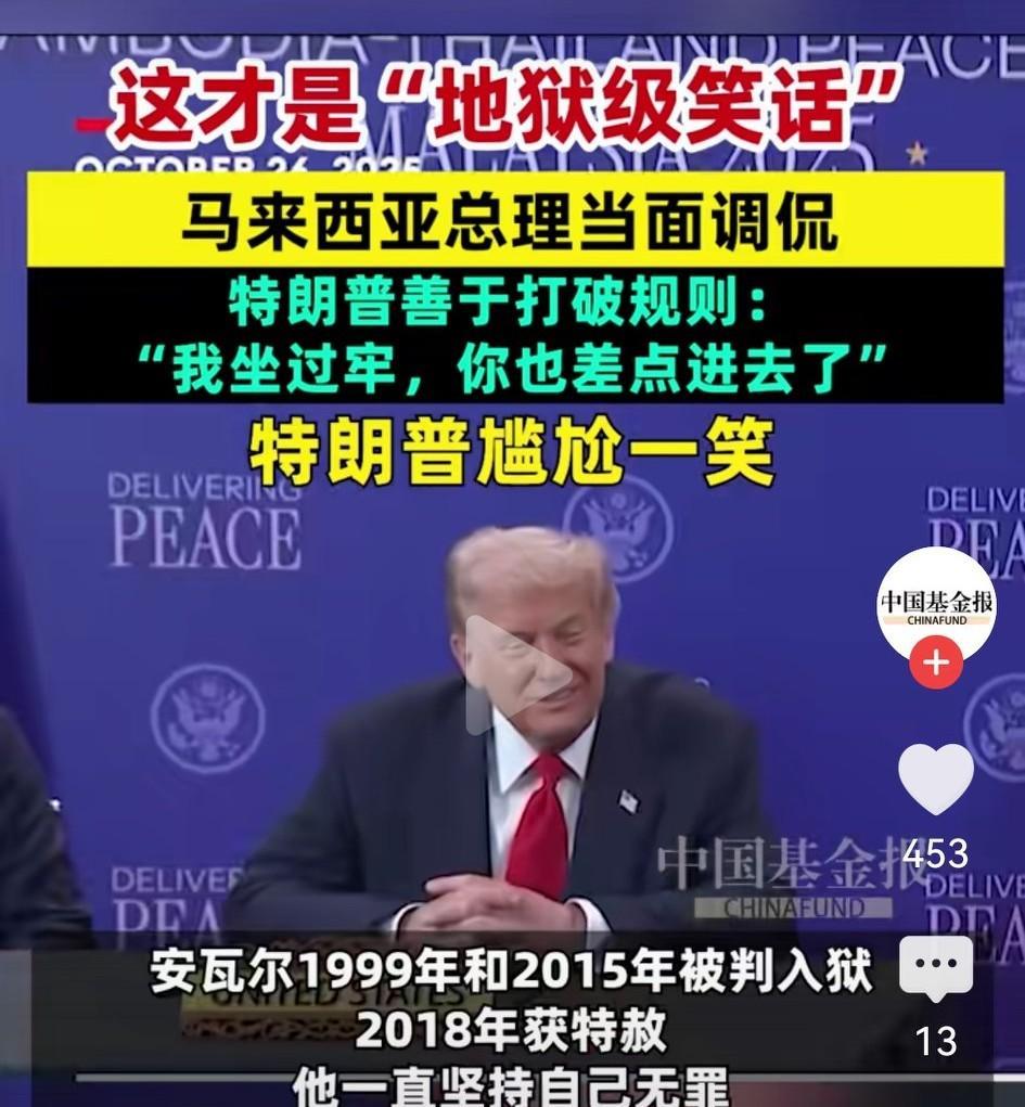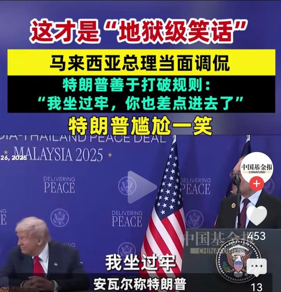 东盟与伙伴国对话环节,马来西亚总理安瓦尔,介绍美国总统特朗普的一个小插曲,堪称经典。安瓦尔调侃道:“特朗普是一位善于打破常规的总统,这一点,我们很相似,我坐过牢,你也差一点就进去了。”听到这里,特朗普尴尬地笑了笑。看到这里,我明白了,特朗普虽然嘴上没说,心里已经回应了,他说的是:“我挨过枪子儿,你挨过啊。”