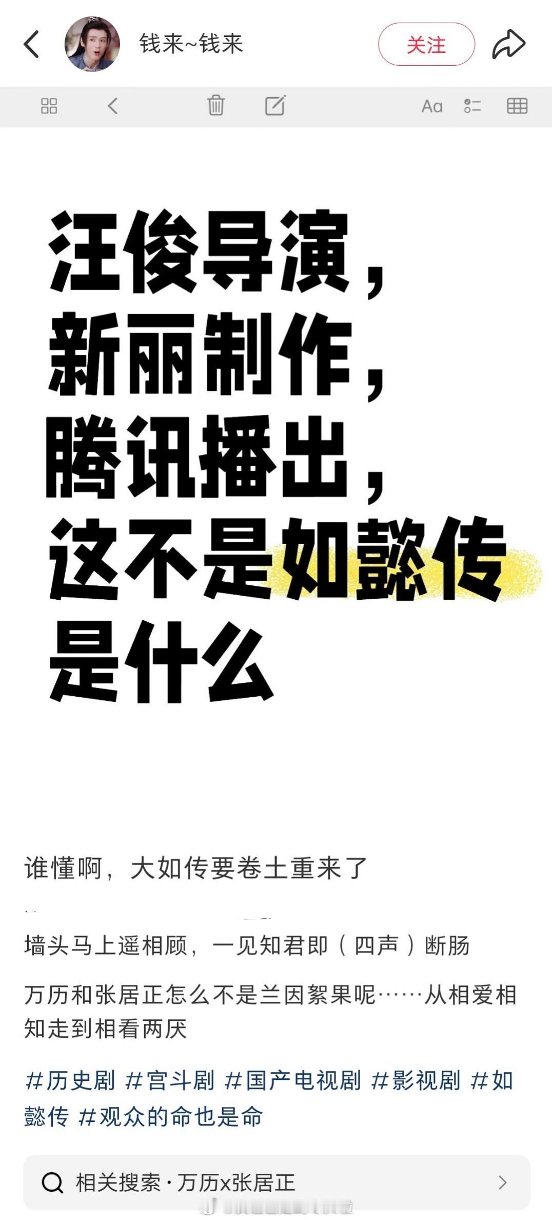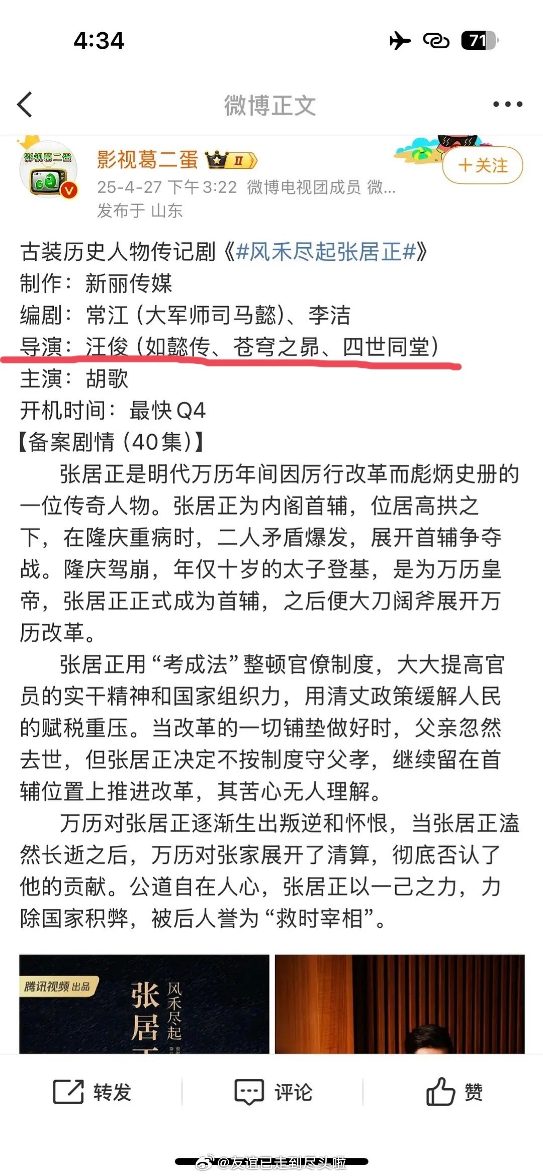 张居正只单宣了胡歌,没有官宣导演,之前一直网传是汪俊,该说不说,汪俊+新丽+腾讯的配置也太大如传2.0了。