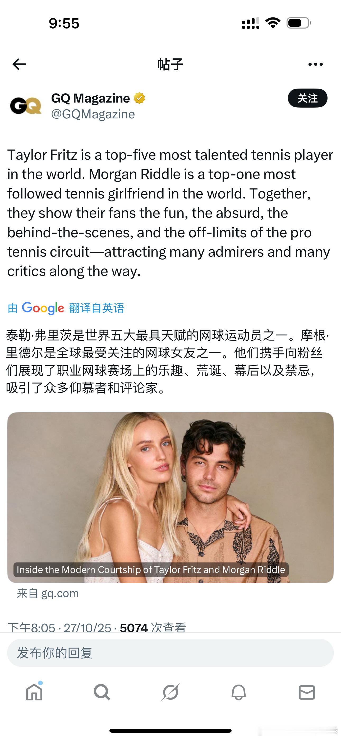 弗里茨与网红女友携手向粉丝们展现了职业网球赛场上的乐趣、荒诞、幕后以及禁忌
