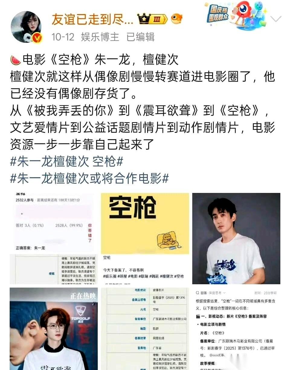 我愿称之为年度最尴尬官宣,没有之一。 一部双男主电影,片方扭扭捏捏地,先放出来一个一番男主:朱一龙。 按理说,这咖位,这阵仗,评论区怎么也得锣鼓喧天鞭炮齐鸣吧? 结果呢? 好家伙,我点进去一看,满屏都在问: “檀健次呢?” “所以檀健次到底还演不演?” “我等着官宣檀健次呢!” 主角本人,查无此人。官宣了个寂寞。 你说这叫什么事儿? 这事儿妙就妙在,它不是粉丝互撕,也不是谁对谁的恶意。 它就是市场最真实、最不加掩饰的一次“用脚投票”。 朱一龙当然是好演员,没人否认。 但檀健次那边,刚播完的剧热度正高,口碑也好,憋着一股劲儿要往上冲。所有人都伸长了脖子,看他能不能凭这部电影,一脚迈进新天地。 这股子“期待值”已经拉满了。 结果你官宣了A,大家的心思却全在B身上。 A的热度,成了B人气的试金石。 我隔着屏幕,都替宣发团队捏了把汗。真的,太残酷了。 有时候红不红,自己说了不算,团队说了也不算。 观众的注意力在哪儿,聚光灯就在哪儿。