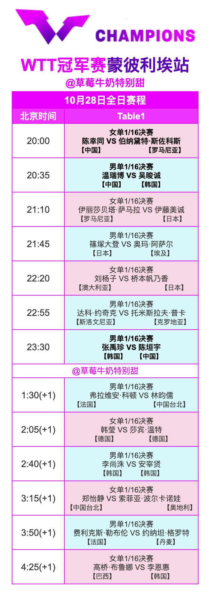 国乒蒙彼利埃冠军赛28日29日赛程表 参赛的国乒队员们昨天晚上参加了万圣节主题的晚宴, 大家都玩的很开心。 只是咱们到达的比较晚,需要倒一下时差,但是看起来状态都超级好。 1/16决赛分两天完成, 28号:陈幸同,温瑞博,陈垣宇 29号:蒯曼,王艺迪,向鹏,陈熠 首轮比赛不好打,尤其是男线这边, 做好困难准备, 中国队加油💪