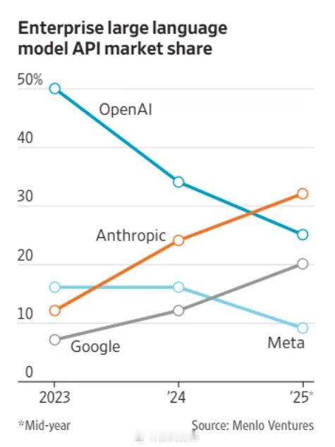 Anthropic 在企业级大型语言模型(LLM)API 市场份额上超过 OpenAI 。根据 Menlo Ventures 等机构的报告,Anthropic 的 Claude 系列模型在 2024-2025 年间快速迭代,推动其市场份额从 12% 跃升至 32%,而 OpenAI 则从 50% 降至 25%。