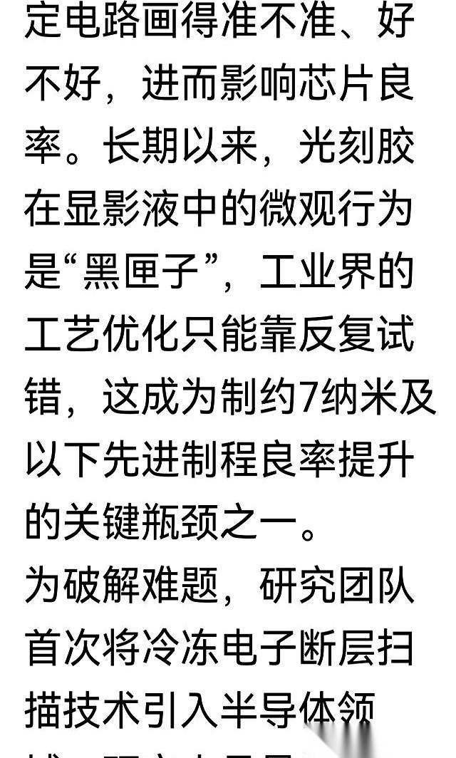 芯片这事儿,卡脖子卡了这么久。 咱都知道难,但到底难在哪? 说白了,就是你好不容易按图纸造出来了,一百个里面,可能九十个都是废品。这谁受得了? 这个要命的问题,就叫“良率”。 成本高到天上去,一直以来,这就是个“黑匣子”,没人知道为啥那九十个就莫名其妙坏掉了。 现在,北大的彭海琳教授团队,把这个黑匣子给撬开了。 他们干了件特牛的事儿。 就好比,在芯片制造那个比头发丝还细无数倍的微观世界里,架上了一台超高清的3D摄像机,全程直播。 第一次清清楚楚地看见了,原来是某些关键的“小材料”(光刻胶分子),在液体里不听话,自己抱团、打结,最后导致了整个芯片的报废。 看明白问题在哪,解决问题就只是时间问题了。 这事儿牛就牛在,它不是说我们又造了个什么新机器。 而是我们从最最底层的物理原理上,搞懂了“为什么会失败”。 这比什么都重要。 知道这意味着什么吗? 意味着我们不再是摸着石头过河,我们手里有了地图和指南针。 7nm以下的芯片,从“偶尔能撞大运做一个”到“可以稳定地、大规模地做出来”,最关键的一道坎,我们正在跨过去。 真的,别总盯着屏幕上的明星八卦了。 多看看这些默默无闻的科学家吧。 他们,才是这个时代真正的定海神针。