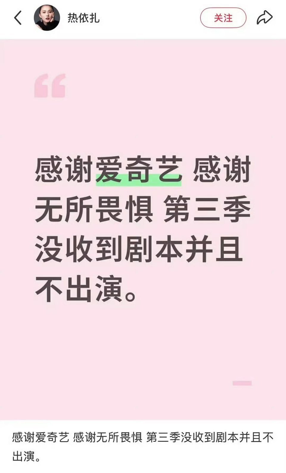 我理解的意思是说《无所畏惧》她没有收到剧本,而且因为自己妈妈要做手术,女儿要养,抽不开身,所以也不会演
