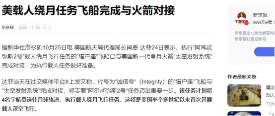 10月26日财联社电,美国航天局代理局长肖恩·达菲对外宣布,执行阿耳忒弥斯2号载人绕月飞行任务的猎户座飞船,已经成功与新一代登月火箭太空发射系统完成对接。这可是自打1972年阿波罗计划结束后,美国半个多世纪以来头一回准备把人送去深空,意义非同一般。   这次对接是在肯尼迪航天中心的航天器装配大楼里弄好的。从现场照片能看得很清楚,这个组合体足足有98米高,在大楼里杵着就像一座金属巨塔。   这个组合体里的猎户座飞船有个专门的代号,叫“诚信号”。它不是NASA单独搞出来的,是NASA和洛克希德-马丁公司一起研发的产物。   这款飞船有个关键本事,它是目前唯一能搭载宇航员完成深空飞行,还能让他们安全返回地球的航天器。   对接刚完成,任务团队就立刻投入了后续工作。他们要先给飞船和火箭建立起电力连接,数据传输线路也得同步接通。这些连接弄好后,一系列集成测试就会紧跟着展开,所有环节都得确保没问题才行。   NASA已经敲定了2026年4月的发射窗口,这趟飞行会搭载4名宇航员。乘组里有3名美国宇航员,分别是里德·怀斯曼、克里斯蒂娜·科赫和维克多·格洛弗,还有1名来自加拿大航天局的宇航员杰里米·汉森。   科赫之前创造过女性太空停留时间的纪录,怀斯曼有丰富的国际空间站工作经验,格洛弗则是首位长期驻留空间站的非裔美国宇航员。   这趟任务不会让宇航员登上月球表面,核心目标是绕月飞行。宇航员们会在飞行中做一系列科学实验,还要测试飞船的生命支持系统在深空环境里靠不靠谱,深空通讯技术能不能稳定工作,顺便观察人类在这种环境下的适应情况。这些测试数据对后续的登月任务至关重要。   阿耳忒弥斯2号其实拖了好几次才走到今天这步。它原本计划2024年就发射,后来一再推迟,先是改到2025年9月,现在又定在了2026年4月。连后面的阿耳忒弥斯3号载人登月任务,也跟着推迟到了2027年年中。   推迟的原因挺复杂,技术难题是主要因素。而且这个计划跟当年的阿波罗不一样,NASA特别依赖私营企业,很多关键设计和运营工作都交给了私企。   原本想省点钱、分摊点风险,没想到反而影响了进度。光是从启动到2025年,这项目的花费就预估到了930亿美元。   不过这次对接确实是个大进展。它标志着阿耳忒弥斯2号任务迈出了关键一步。等集成测试全部完成,明年就会把这个98米的大家伙运到发射台,做最后的发射准备。   阿耳忒弥斯计划的终极目标远不止绕月飞行。NASA想在月球南极建个永久性基地,让宇航员能长期驻留。月球南极有水资源,这些水不仅能供人使用,还能分解成氢气和氧气当火箭燃料。   这个基地建好后,还能成为未来探测火星的中转站。半个多世纪前,美国宇航员踩着阿波罗飞船登上月球。现在,他们想用这套新组合体重新开启深空探索。这一步踩稳了,后续的登月、建基地、探火星才能更有底气。   来源:新京报 【美载人绕月任务飞船完成与火箭对接】