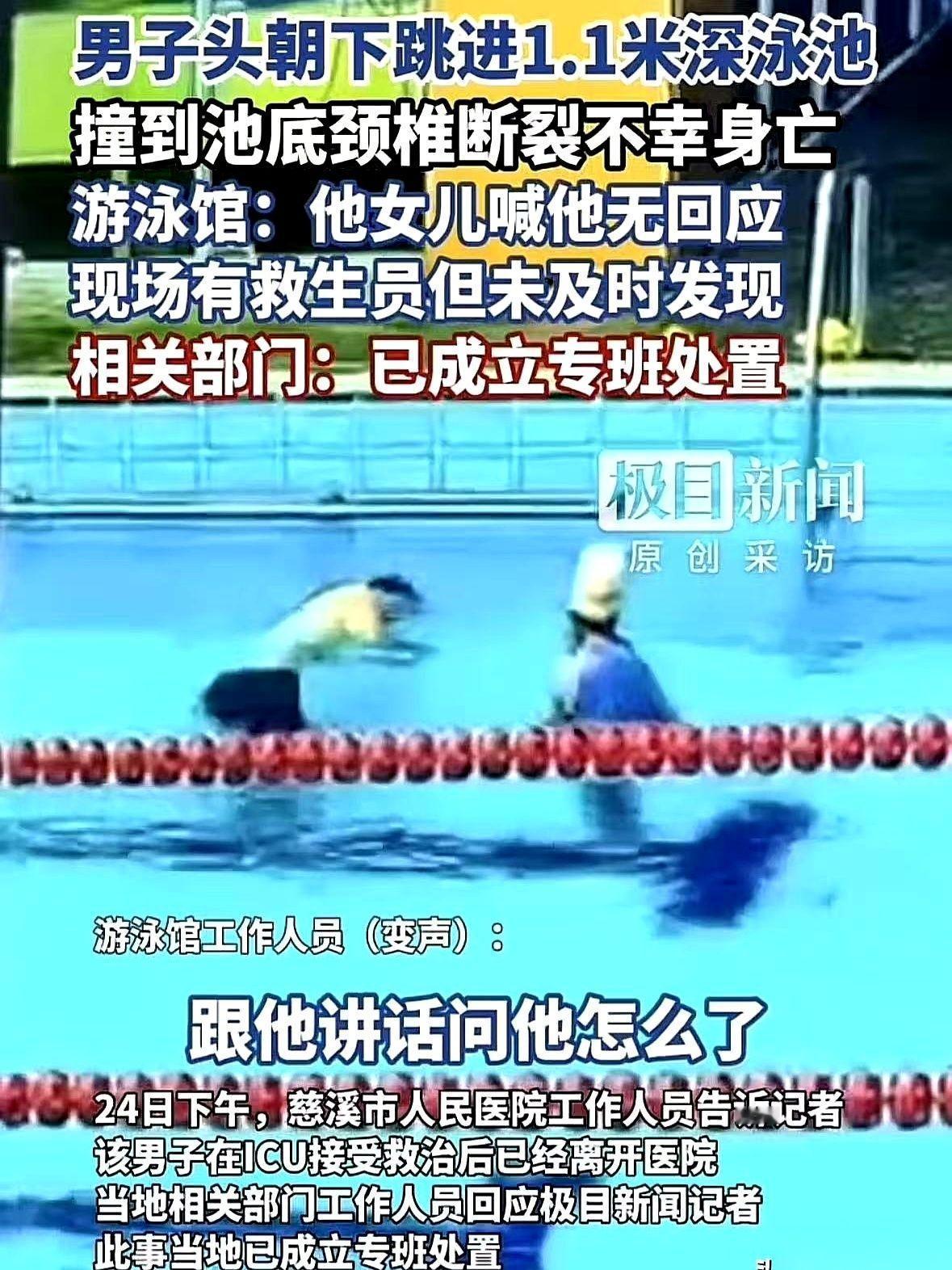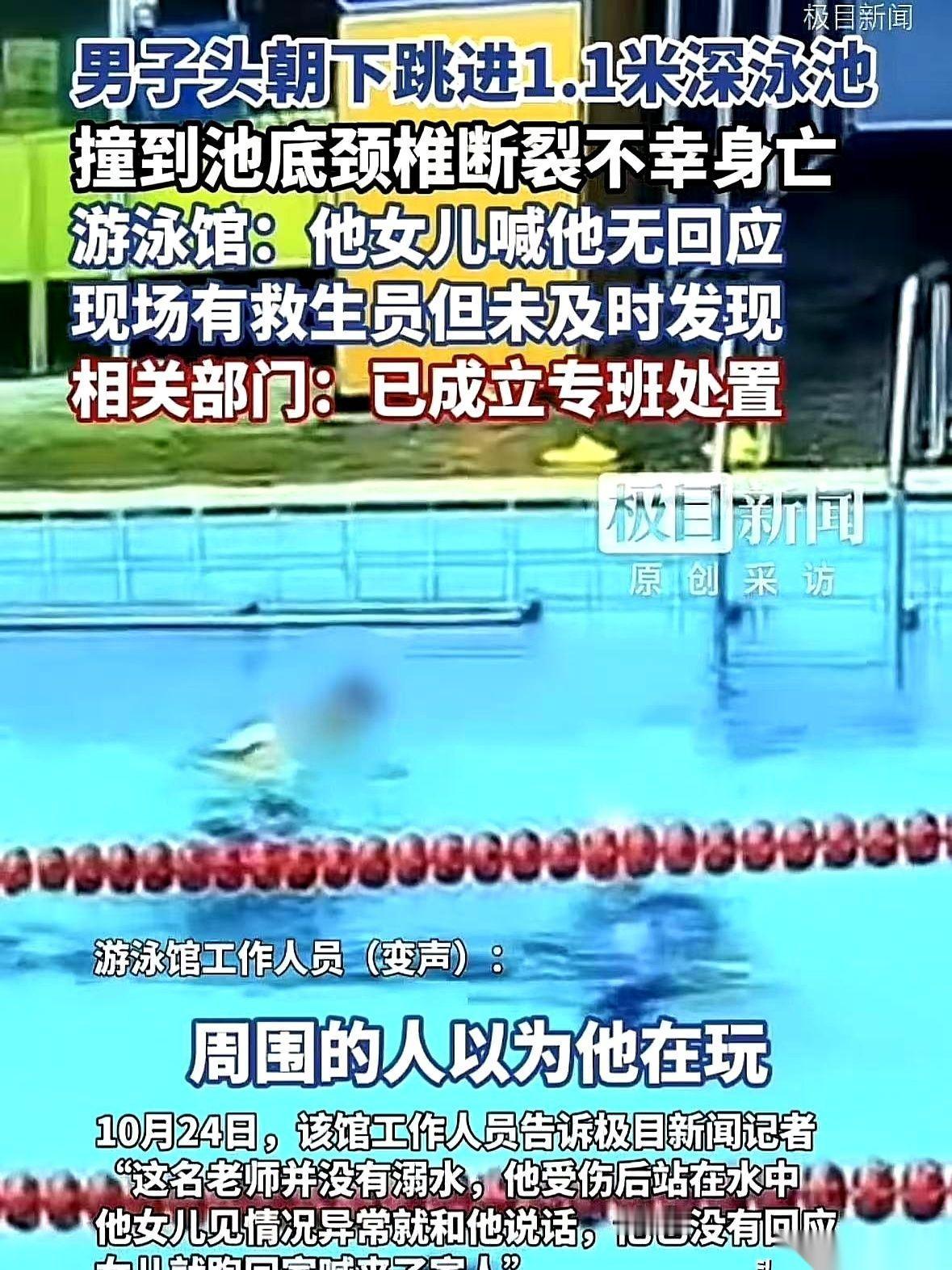 真的,有时候最让人害怕的,不是声嘶力竭的呼救,而是那种死一般的寂静。 一个男人,就那么弯着腰,僵在1.1米深的泳池里。 一动不动。 旁边是他7岁的女儿,不停地喊“爸爸”,拉他的手,可他就是没反应。 你能想象那个画面吗?周围是嬉笑打闹的人群,水花四溅,一片欢乐。而就在这片欢乐里,一个生命正在无声地流逝。 更讽刺的是,他是个体育老师,是游泳馆的常客。就因为一个最不该犯的错误——在浅水区头朝下跳水。 “咣”的一声,脑袋撞到池底。 然后,世界就静止了。 最让我心疼的是那个小女孩。 她不知道发生了什么,她只知道爸爸不理她了。她努力地想把爸爸“扶”起来,坚持了12分钟,最后只能哭着跑回家找妈妈。 “爸爸在水里站着不动……” 等家人赶到,16分钟过去了。 他还在那儿,保持着那个姿势。 后来家属和泳池吵得不可开交。家属说,救生员干嘛去了?16分钟看不见一个人? 泳池也委屈:他没溺水,没呼救,就那么站着,女儿还在旁边,谁都以为他是在陪孩子玩水呢! 他肺里一滴水都没有。 他是颈椎断了。 是在一片热闹喧嚣中,安安静静死去的。 这事儿真让人后背发凉。 它告诉你,那些“禁止”的标语,真不是写着玩的。那些你以为自己“心里有数”的老规矩,恰恰是悬崖边上唯一的护栏。 有时候,夺走你一切的,根本不是什么惊涛骇浪。 就是一个你觉得“没事儿”的,小小的、愚蠢的念头。