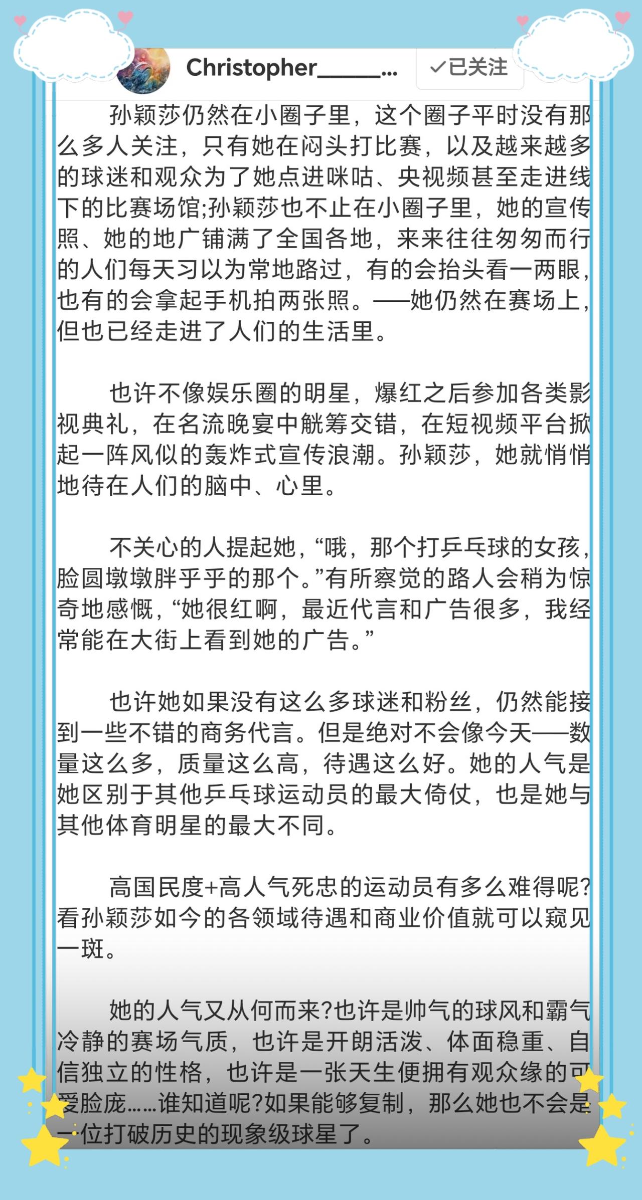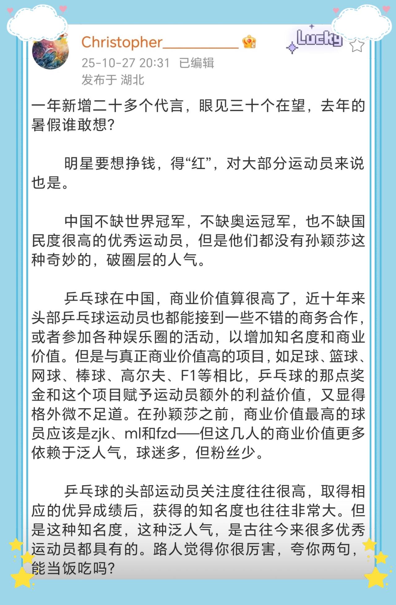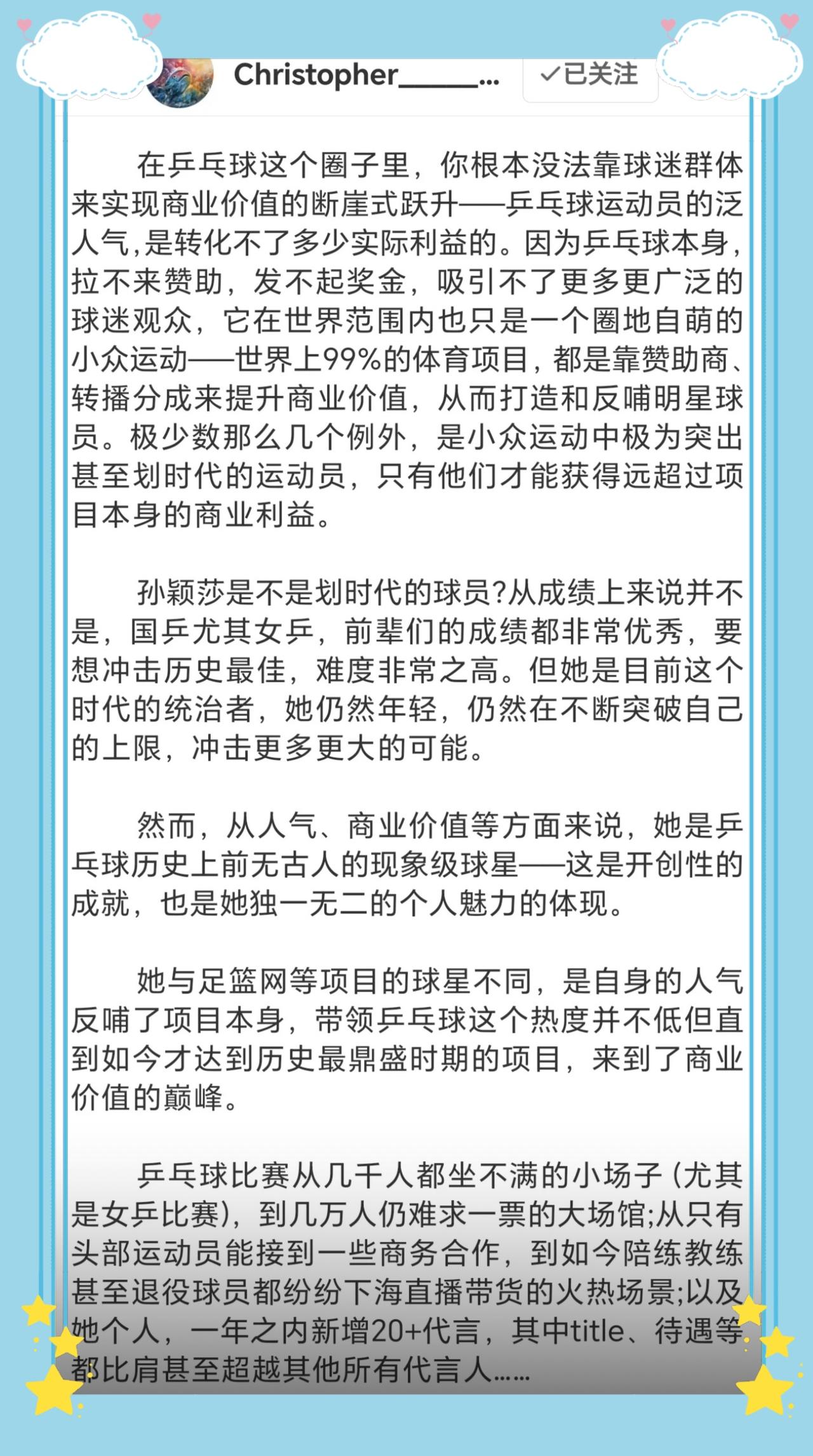 分享一段关于孙颖莎的描述,她是一位打破历史的现象级球星。 一般有成绩的,会被称为优秀运动员; 有成绩有知名度有人气的,被称为体育明星; 有成绩有巨大影响力号召力,有破圈层人气的,被称为超级巨星。 中国的确不缺少世界冠军,奥运冠军, 孙颖莎的成绩比起前辈们,不算最耀眼, 但她更让大家佩服的是,永远都在拼搏努力的路上。 很多人打一场球,赢了,大家会说挺厉害,打得不错, 但是仅此而已。 而孙颖莎的球迷,无论输赢,都会坚定的支持加油, 不管多远,都会有追随, 没有她的赛场,现场要比有她的赛场冷清很多很多。 这是事实,不需要反驳。 有很多人就是去看她比赛的,单纯这一个现场就已经是踏破历史级别。 因为有她,赞助商源源不断,门票不够卖, 周边所有产业都在带动, 她的人气带动了周围的所有人气。 别人是靠项目出圈, 她恰恰相反,她是靠自身的人气反哺项目本身, 所以,她是乒乓球历史上前无古人的现象级球星。 她不需要参加各种觥筹交错的场合, 但是她的的粉丝覆盖所有精锐行业, 她只管打球, 她只管拍摄,其他的粉丝会搞定。 所以,她的高国民度+高人气死忠,是任何一个人都无法比拟的。 她的粉丝的覆盖面太广,太高。 她巨大的商业价值,源自她的个人魅力! 现在她还不是顶峰, 她还在上升的路上, 但她已经是一位打破历史的现象级球星!