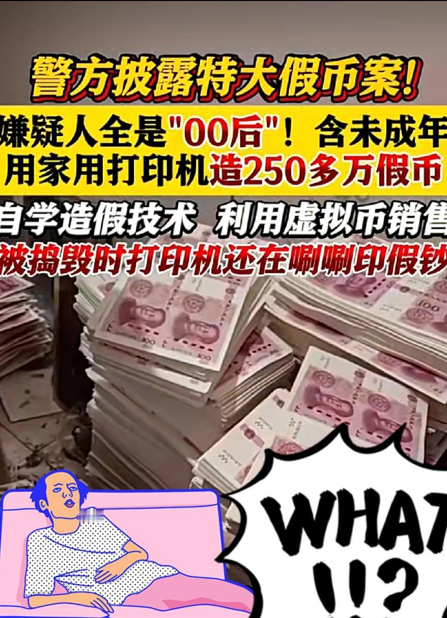 00后用家用打印机,造假币?!违法行为不可取! 北京警方近日捣毁一个由00后主导的假币制造团伙,抓获15名犯罪嫌疑人,缴获250多万元假币。 小伙子是真“聪明”,可惜用错了地方。不该干违法乱纪的事情,造的假币因太假,还专挑老人下手,呜呼哀哉! 假币钞票
