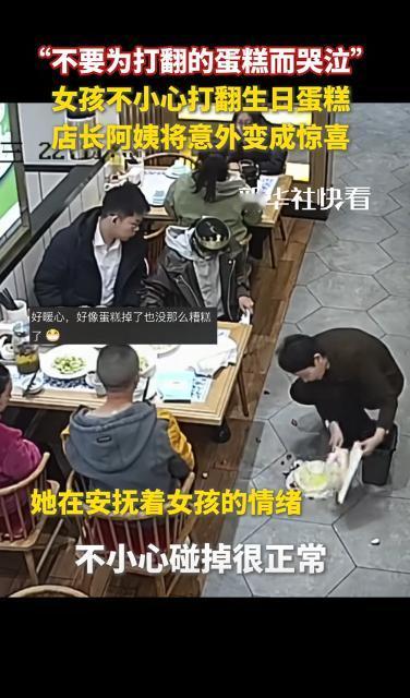 新疆一女孩去饭店过生日,特意带了生日蛋糕,没想到刚拿出来,蛋糕就打翻在了地上,一旁服务员阿姨看到立马走了过来,接下来的举动让小姑娘很是感动。 事情的起因是小张(化名)在过十九岁生日时就与父母和哥哥一起来到了饭店庆祝生日,然而就在菜上齐准备切蛋糕的时候,只因为小张拿水壶这一普通的动作,直接导致蛋糕正面朝下栽了下去。 这时候小张和家人当时愣住,气氛一下子凝固,然而就在这时,餐厅的一名服务员迅速上前,没有责怪,也没有犹豫,只说了一句“没关系,我来收拾”。 这句话让小张从惊慌和懊恼中缓过神来,也稳定了现场氛围,体现了她的专业能力。 接着,服务员开始处理蛋糕本身,她拿起水果刀,把接触地面的蛋糕底层切掉,保留干净的上半部分,这个处理非常关键,保住了蛋糕的核心部分,也保证了生日仪式能够继续进行。 她还说了一句“你看,一点都不影响”,让女孩和家人的注意力从蛋糕损坏转向还能使用的部分,很快缓解了失落和尴尬的情绪。 然而更令人意想不到的事情发生了,服务员又端来了一盘子各式各样的水果,并告诉女孩说店里面没有淡奶油,所以只能放一点水果来增添美感,小张看到之后顿时流下了泪水。 服务员这个小创意让蛋糕看起来完整而有特色,也弥补了小张因意外产生的失落感,恢复了生日仪式的体验,看到蛋糕重新被打造,小张的情绪从失落变为感动,生日派对的气氛重新回到愉快状态。 整个过程显示了服务员处理问题的专业性、高效性,她不仅解决了实际问题,还修复了情感体验,让一次可能破坏派对的意外变成了让人难忘的温暖经历。 事情还没结束,很快服务员便端来了一碗“长寿面”,象征着祝福,并主动问女孩几岁,得知小张19岁后,她说:“祝你生日快乐,一定要开开心心”,还把祝福送给女孩的家人。 这种细致的互动,让一次意外变成了温暖的记忆,也在女孩和家人心里留下了深刻印象。 事后这件事情被网友刷到了之后,很多网友在下面评论说小张的情绪十分的稳定,要是换做是她,早就已经崩溃的大哭了起来。 此外还有一些网友在下面评论说,这个服务员的服务特别好,值得被奖励点赞,认为这位服务员让平凡的生日变得特别,让大家感受到专业、智慧和真诚。 那么整个过程体现了从高效处理问题,到共情修复体验,再到建立情感联系的完整服务流程,服务员没有让意外毁掉生日,而是用行动和智慧,把破碎的蛋糕变成珍贵礼物,也让女孩感受到被关心和重视。 这个故事告诉我们,最好的服务不仅解决问题,更是用真诚温暖他人,把平凡的生活瞬间变得有意义,留下持久的记忆和感动。 对此,你还有什么看法呢? (信息来源 :新华社快看 )