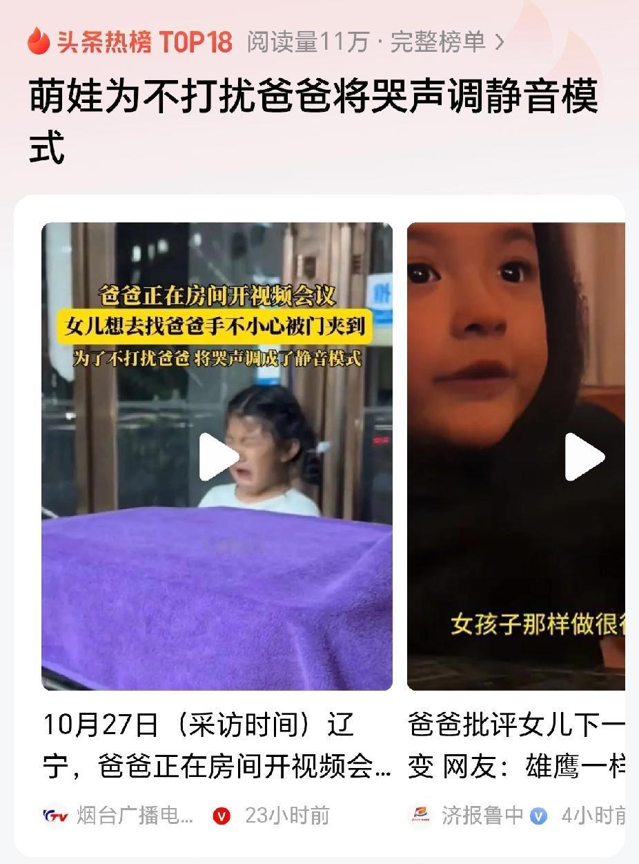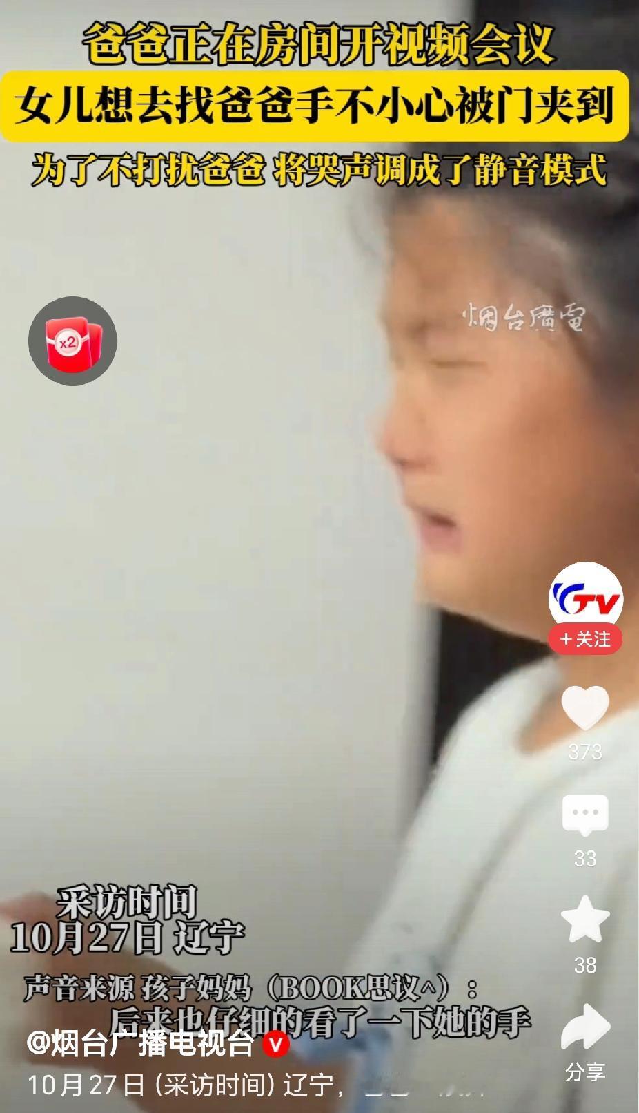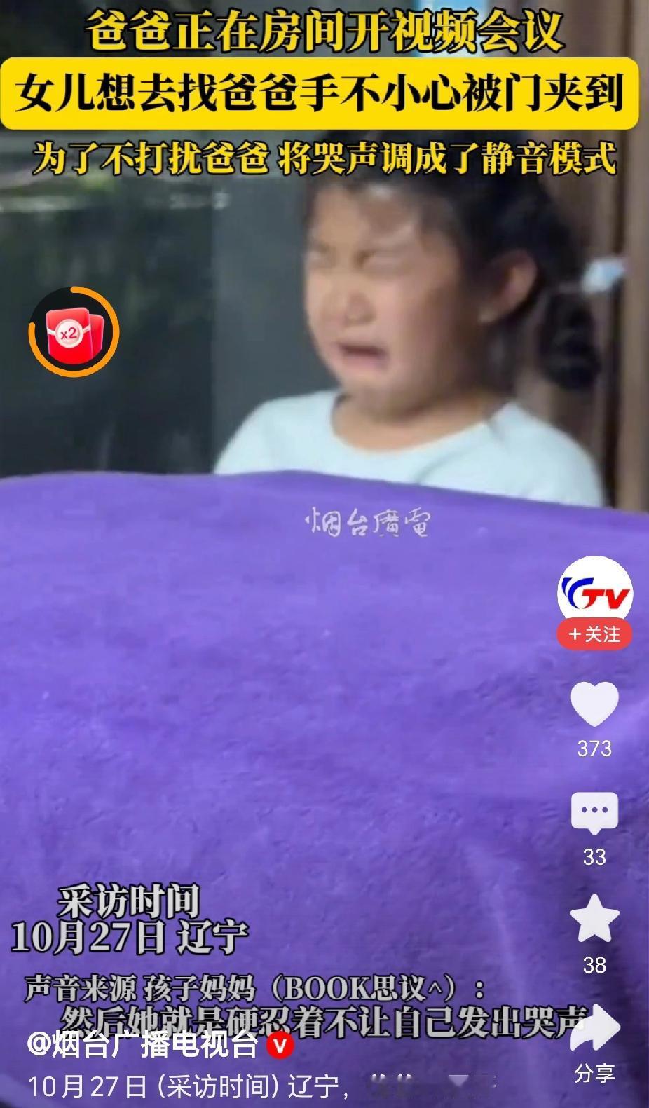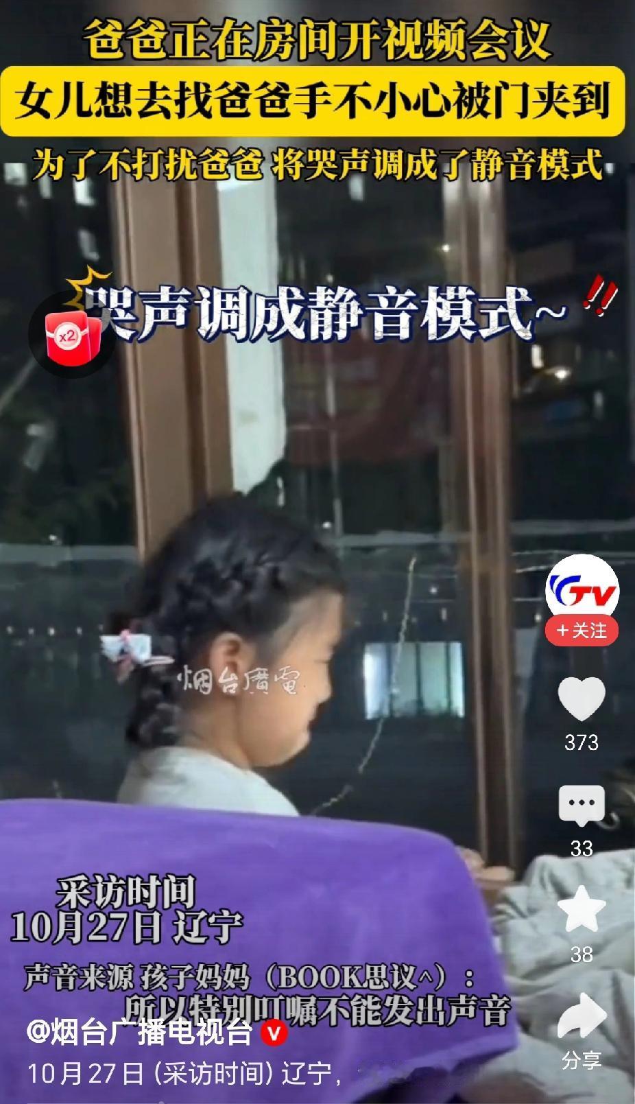 “懂事了,萌娃为不打扰爸爸将哭声调静音模式!”近日,辽宁,一位小女孩想找爸爸,却不小心被门夹疼了,为了不打扰开视频会议的爸爸,忍痛不哭出声音!(来源:@烟台广播电视台) 据视频报道,10月27日,辽宁的一户人家,爸爸正在开视频会议,交代女儿不要弄出声音来,免得打扰到他。 “女儿有一个事情想去找爸爸,开门的时候却不小心被门夹痛了手!”妈妈说,当时看样子确实挺疼的,指头都夹出来红印子。 “面对疼痛,孩子强忍着没有哭出声音来,眼泪扑扑的掉!”妈妈说,爸爸开视频会议,不能弄出声音,所以孩子将哭声也调成了静音。 “这个孩子非常懂事,有大局意识!”有网友评论说,疼成这样了,能够忍住不发出声音来,这非常人可以做到的! “真坚强!”有网友评论说,我家娃碰到一点点事就哭的惊天动地的,一点都不能够忍,这个孩子手指头被门缝夹了,还能够忍住不发声,太坚强了。 是呀,孩子将爸爸妈妈的话记在心上,并且能够忍痛不出声,这真的是非常坚强的孩子,肯定平常爸爸妈妈对孩子也是非常的有耐心,非常的温柔,让孩子懂得爸爸妈妈工作的重要性! 对此,你的看法是怎样的呢? @秋实99 关注人生冷暖,拥抱幸福生活!