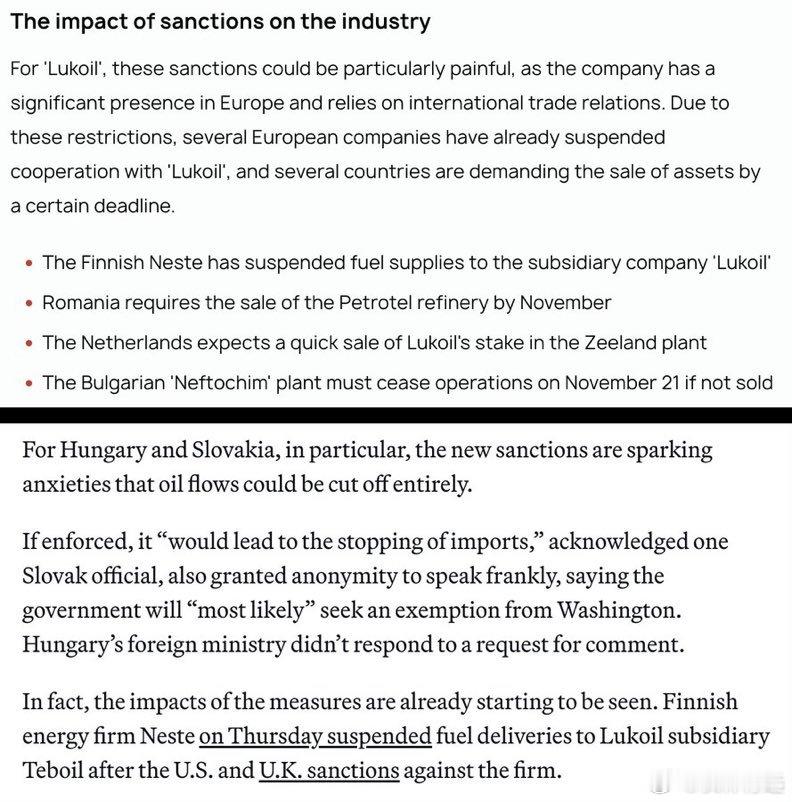 🔹卢克石油公司位于罗马尼亚、保加利亚和荷兰的炼油厂将被出售或关闭
