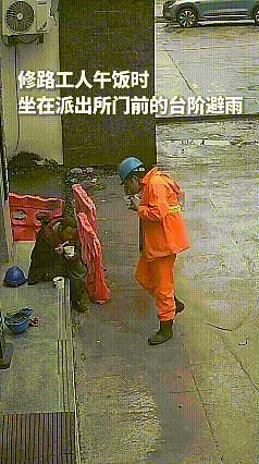 近日,湖北黄石一处派出所门前,几位建筑工人午休时突遇降雨,只好坐在台阶上边避雨边