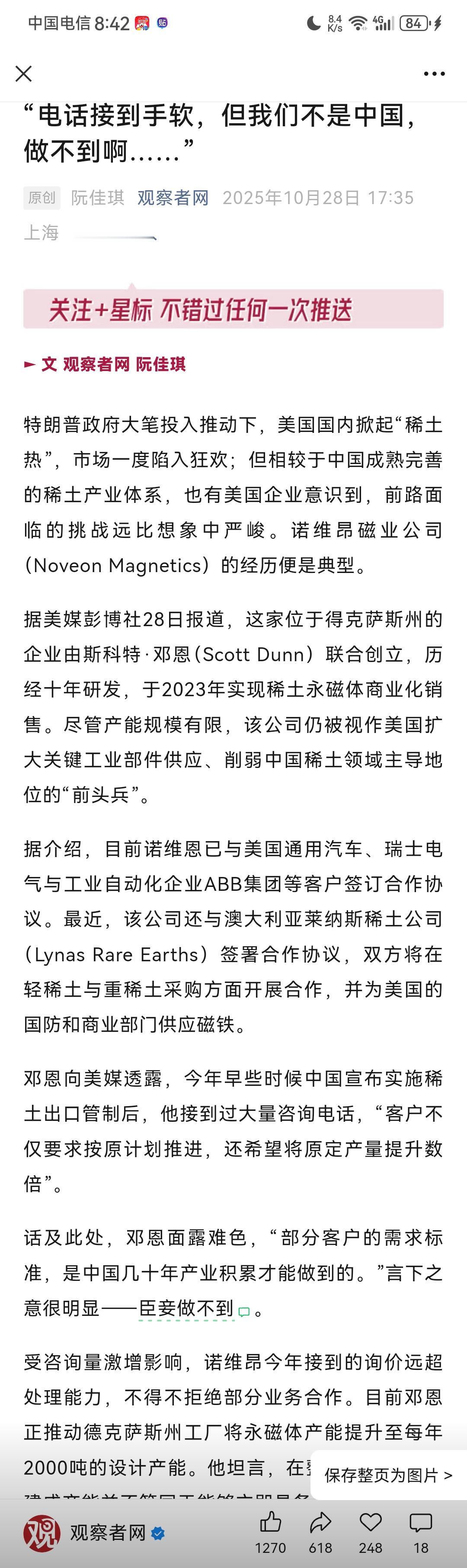 外媒破防了!因为根据彭博社10月28日报道,他们采访了一个资深的美国稀土公司之后,震惊地发现想要在短时间内重建稀土供应链,几乎是不可能的。 彭博社这篇文章指出,最近这段时间,美国国内已经掀起一股稀土热潮,很多机构都准备投资建设稀土产业链,并且还带着一股乐观情绪,认为只要他们开始行动,要不了多久,就能够把稀土给生产出来。 但是,彭博社进行了深入调查之后,却惊讶发现,这个事情根本办不到。现在美国本土,最为资深的一个稀土公司,是得克萨斯州的挪维昂磁业公司,在2023年就已经成功实现永磁体的商业化销售。美国发现这个公司之后,如获至宝,他们没想到美国国内也有一个稀土公司,当即就有诸多大企业向这个公司下订单,要求它扩充产能。 订单就像是雪片一般飞来,按照常理来说,这个公司的老板应该欣喜若狂,可是他看到这些订单,却十分无奈,因为,他这个公司,其实规模挺小,就算是扩充产能,也根本满足不了那么多大公司的要求。他非常直白地说道:“部分客户的需求标准,是中国几十年产业积累才能做到的。”这番话一出,直接就给整个美国都浇了一盆冷水。 因为,这个老板不是一般人,是稀土产业链的真正资深人士,他做出的这个判断,毫无疑问是最为权威的。 也正是因此,现在外媒都是破防了,作为欧美媒体,它之前还是非常自信的,毕竟美国就算是制造业外流,产业空心化,但只要认真起来,重建一个稀土产业链,能有多难?可当其进行深入的实地调查之后,就发现,这个是真的很难!稀土行业资深人士,都直接斩钉截铁地说不可能。 现在美国国内,的确是掀起了一股投资稀土行业的热情,可真要从投资到形成真正可靠的产能,恐怕需要十年,甚至是几十年的时间,而到了那个时候,黄花菜都凉了。