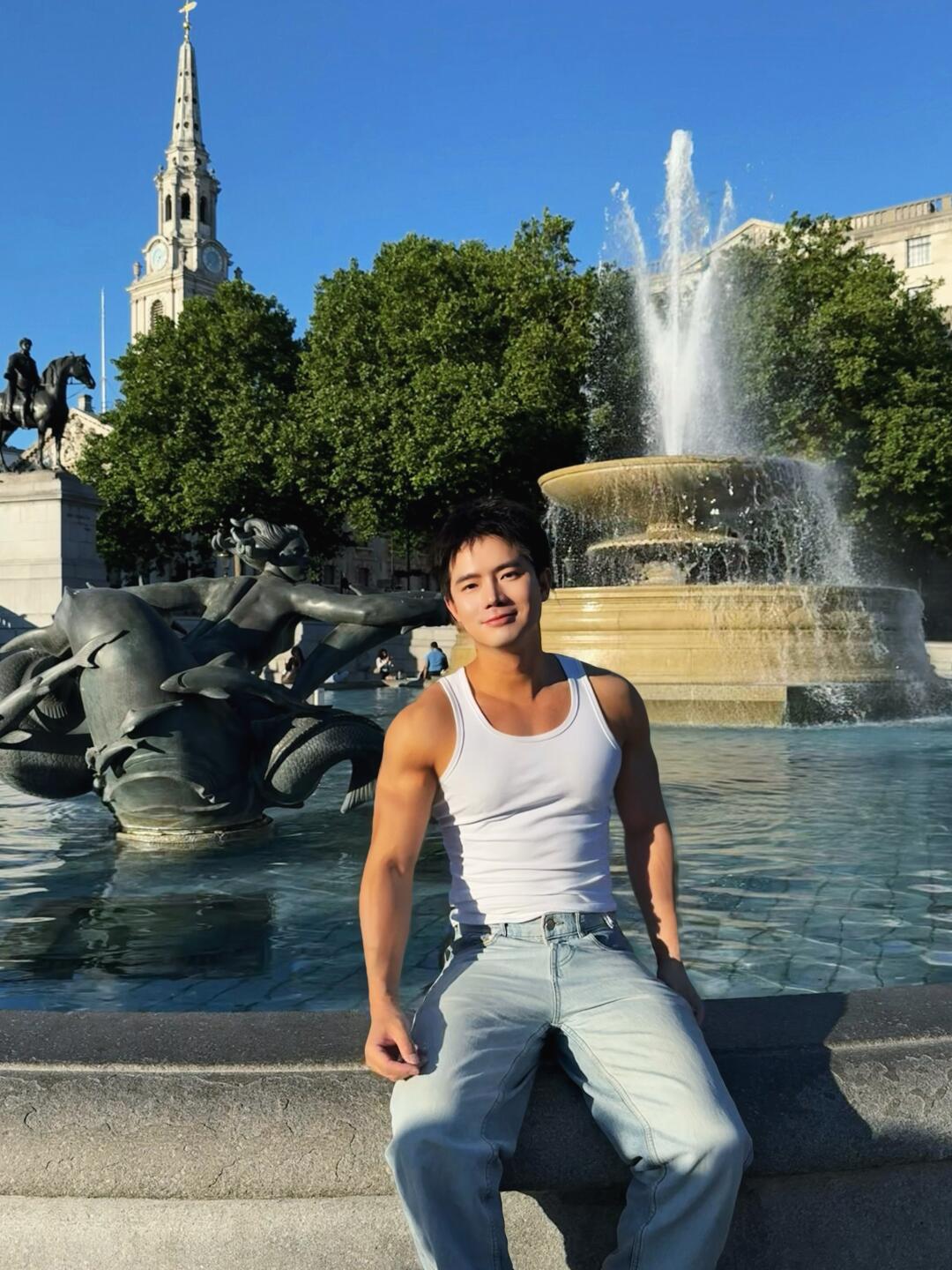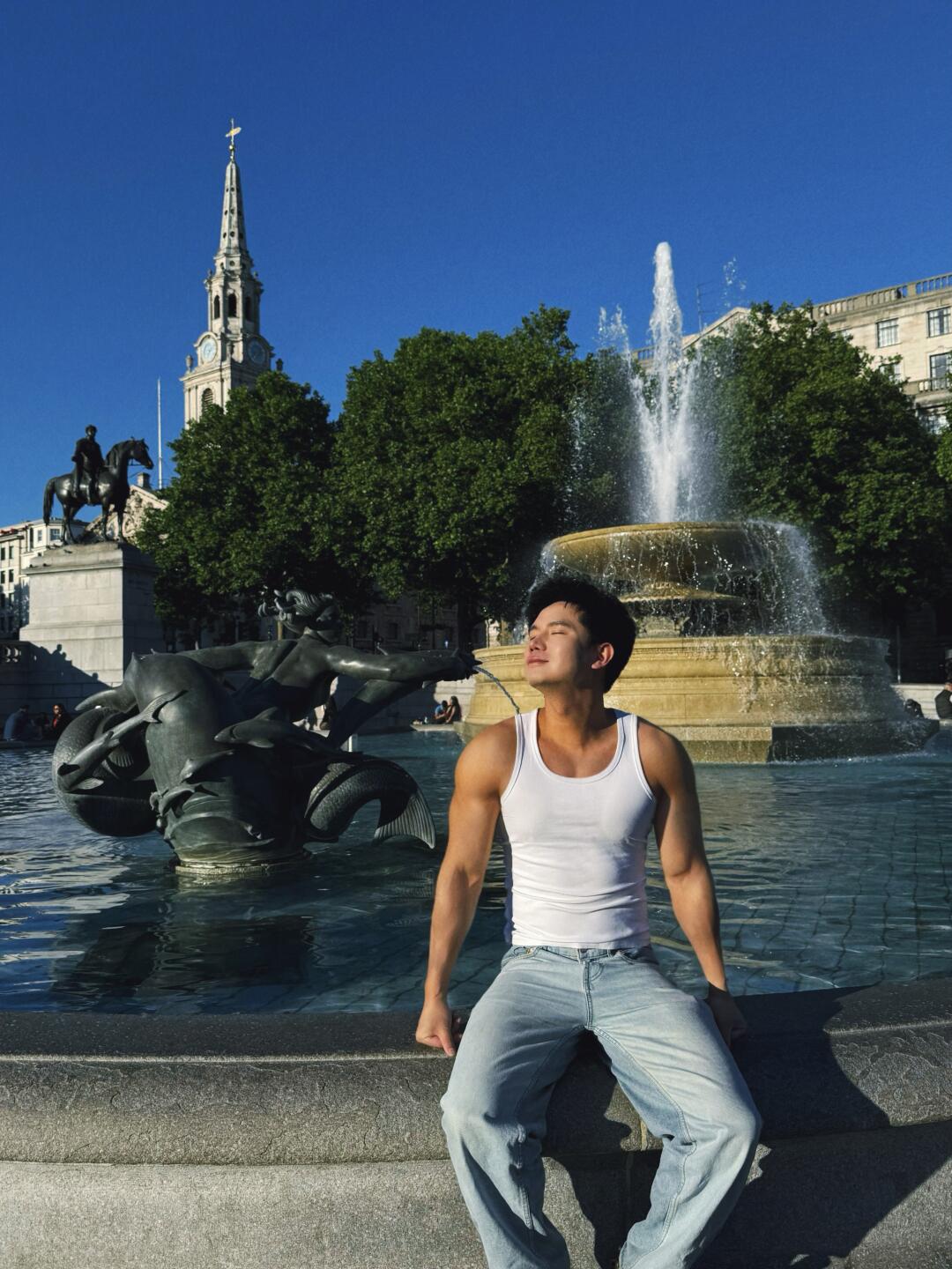 - 伦敦终于进入真正的夏天☀️ 街头的风是温柔的,阳光洒在喷泉边,像一道彩虹。 - 特拉法加广场人来人往,但在某个瞬间,一切都刚刚好城市的节奏停了一下,我按下了快门📸 - 偶尔放慢脚步,感受阳光、石板路和风穿过衣角的声音,也是一种属于伦敦的浪漫💕